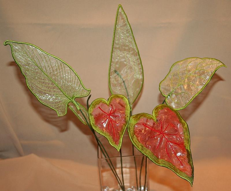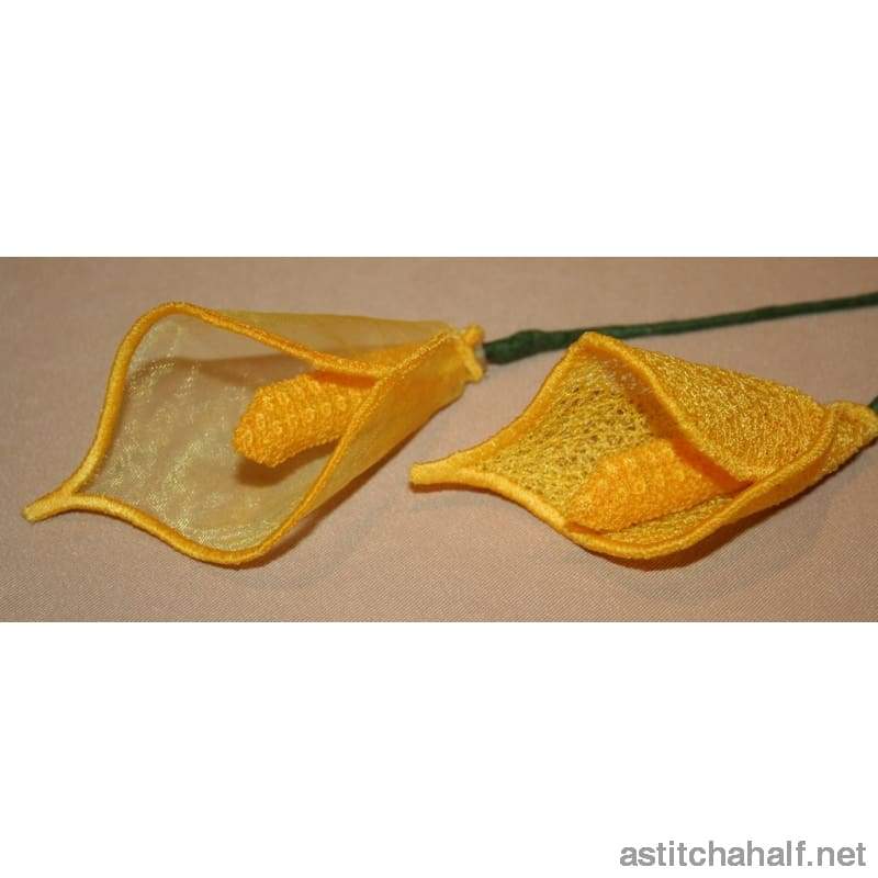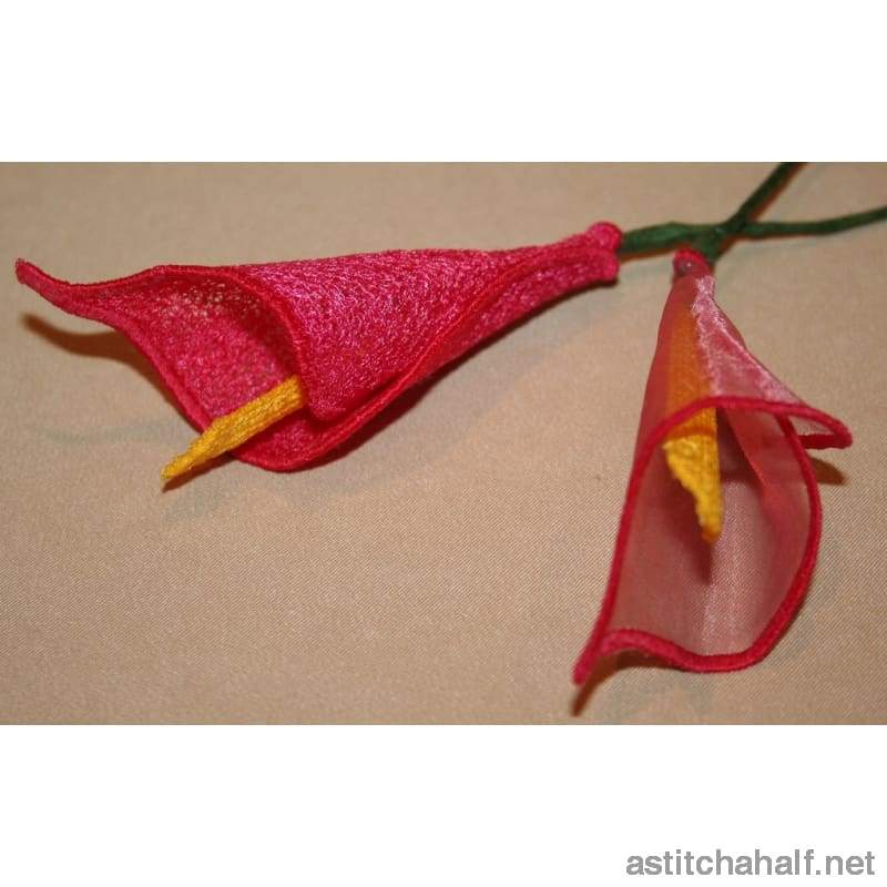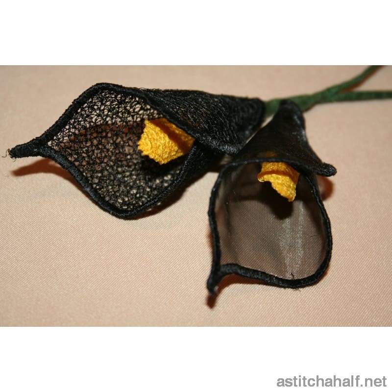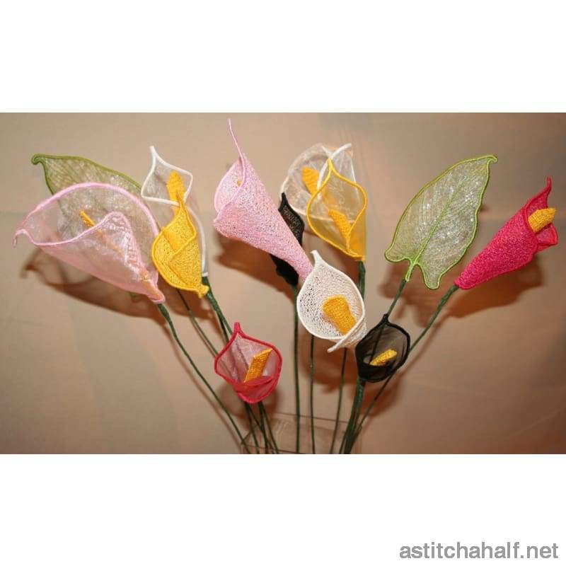 Your own bunch of flowers. Yes, Calla Lilies of all colors and in different sizes. Use your imagination and make up your own flowers. This is a mixture of applique and freestanding lace flowers.