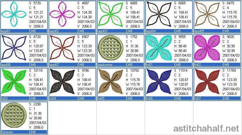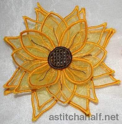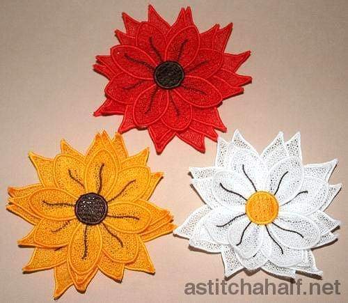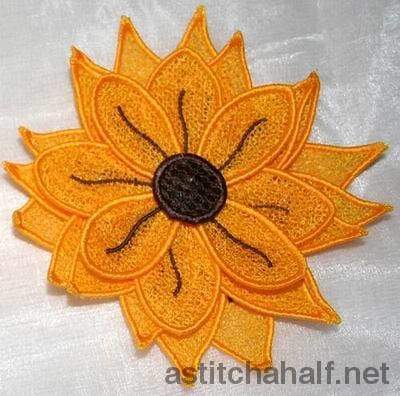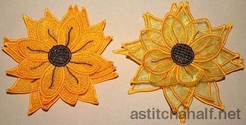 3 x freestanding lace sunflowers and 3 x applique sunflowers in the 5*7 hoop.