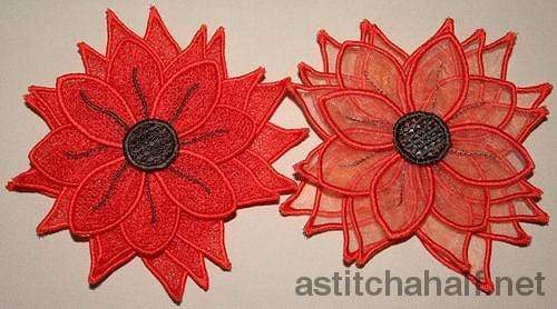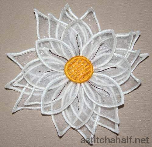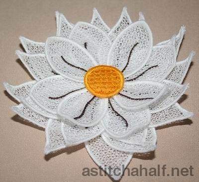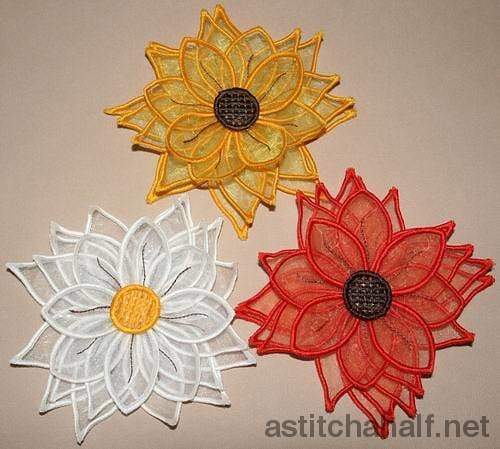 These sunflowers are a great way to adorn your dinner table, tie back your curtains or embellish a gift. Add ribbon to enhance the embroidered flower and finish the center of your flower with your choice of beads, pearls or berries. This is a beautiful mix of freestanding lace and applique sunflowers.
