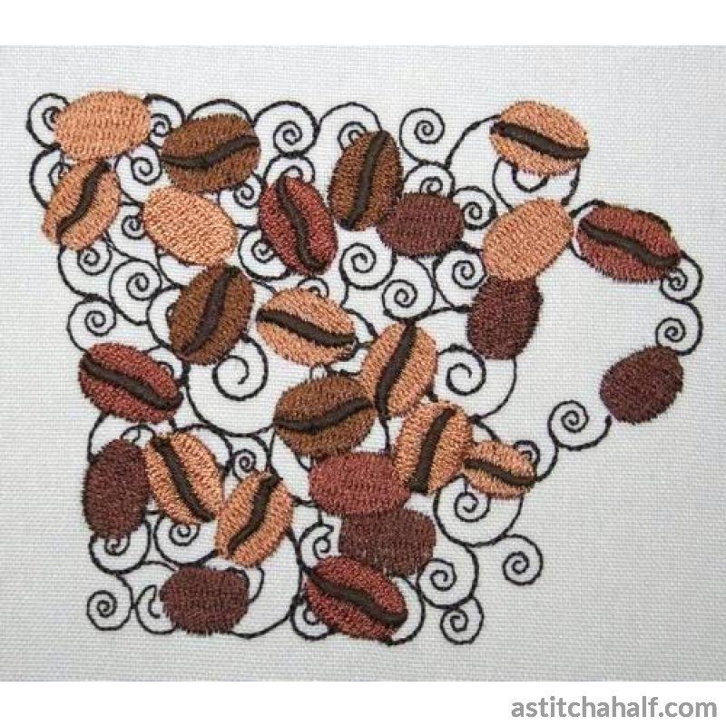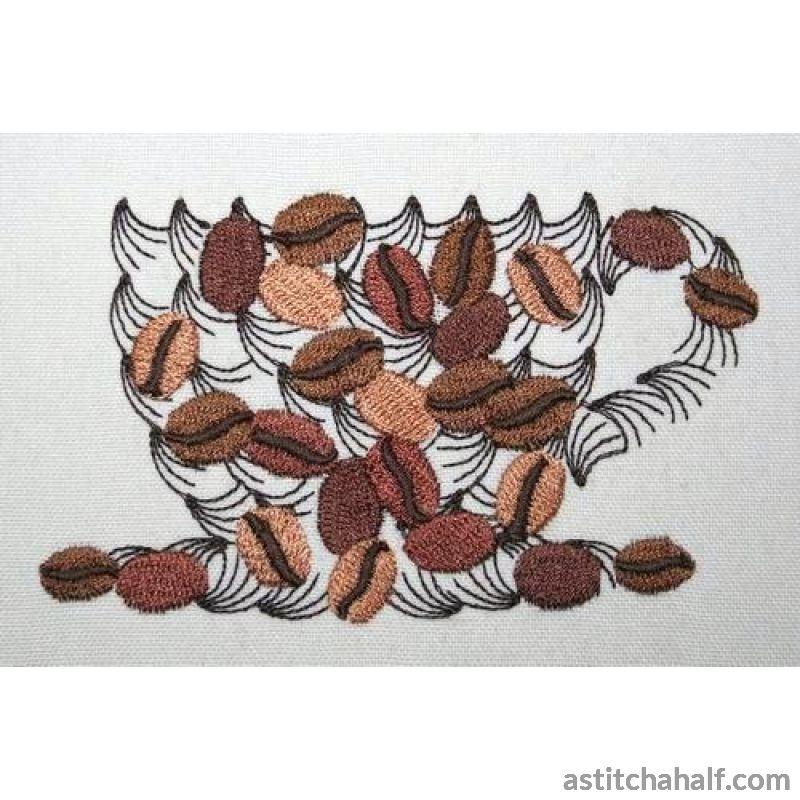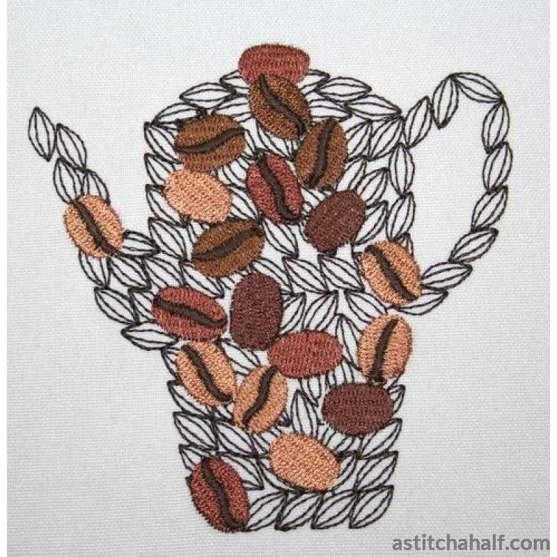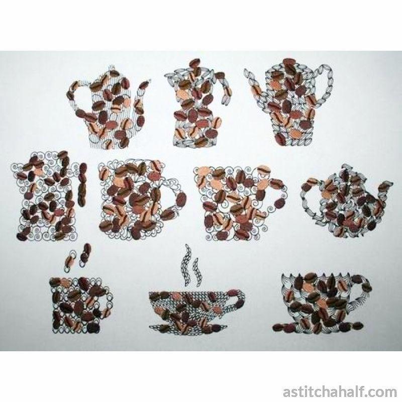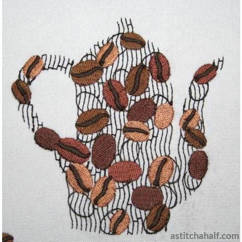 Are you a coffee lover or know someone who loves their coffee...then this collection of embroidered coffee beans, kettles and mugs will enhance their favorite shirt, placemat or gift.
