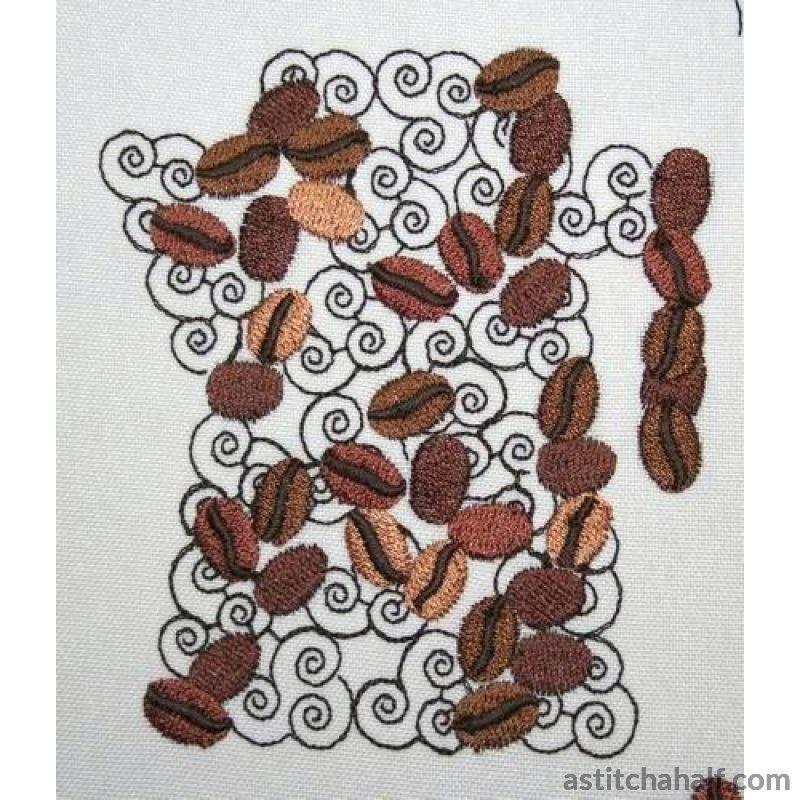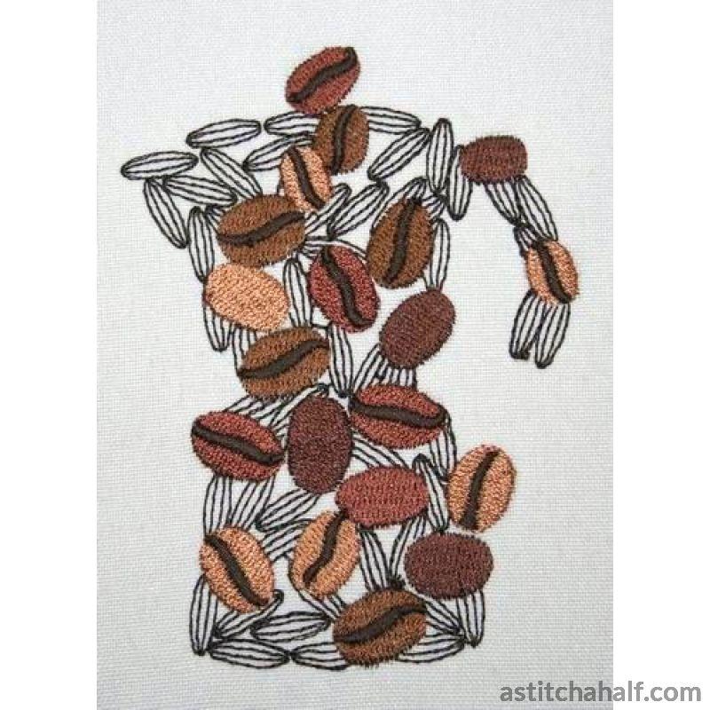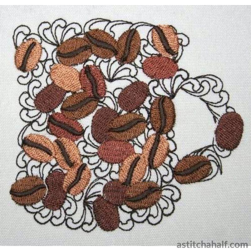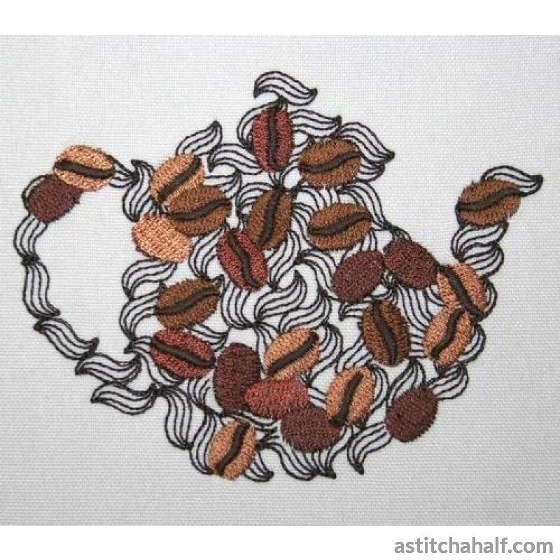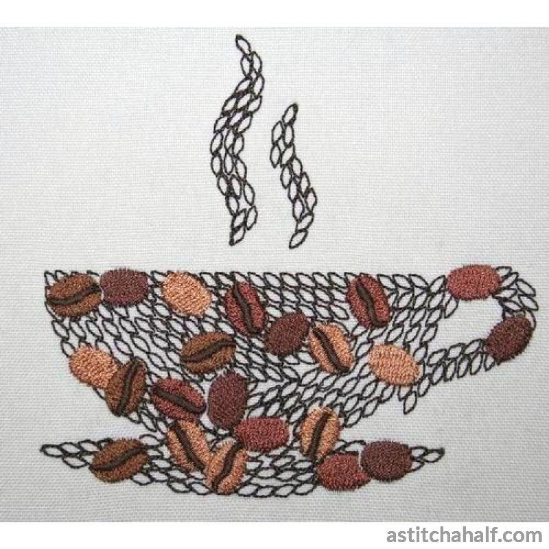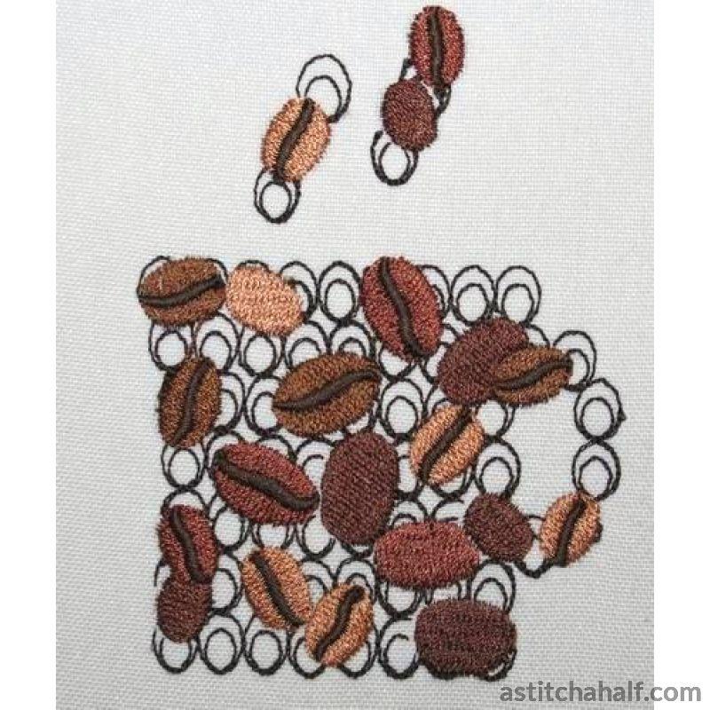 Are you a coffee lover or know someone who loves their coffee...then this collection of embroidered coffee beans, kettles and mugs will enhance their favorite shirt, placemat or gift.