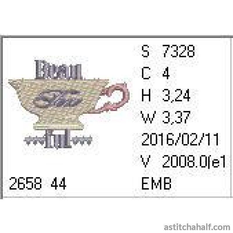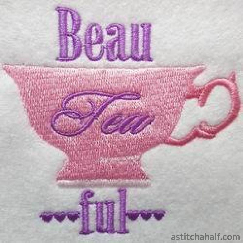 Beau-Tea-Ful or beautiful, it still tastes the same. And this colorful embroidered cup of tea can be used to brighten up your apron, t-shirt, even kitchen cloths.