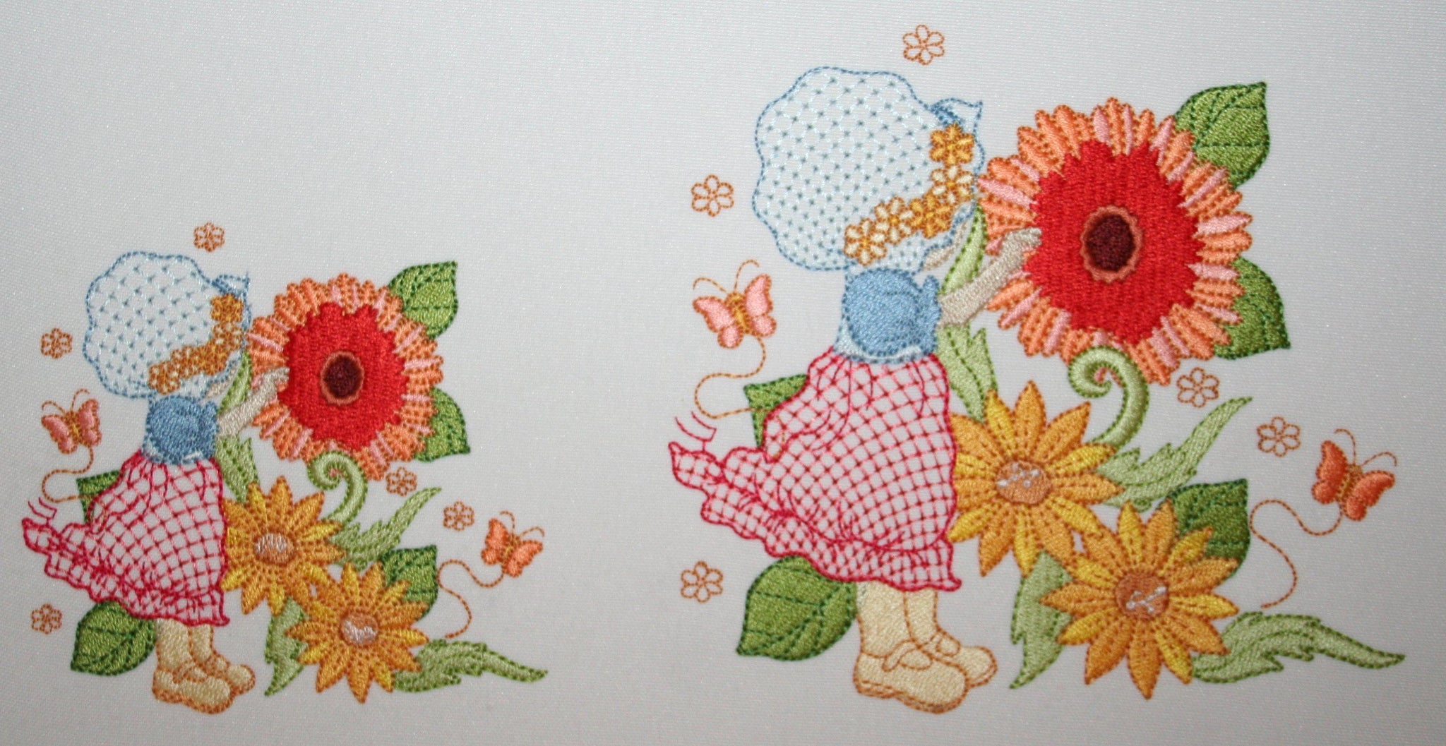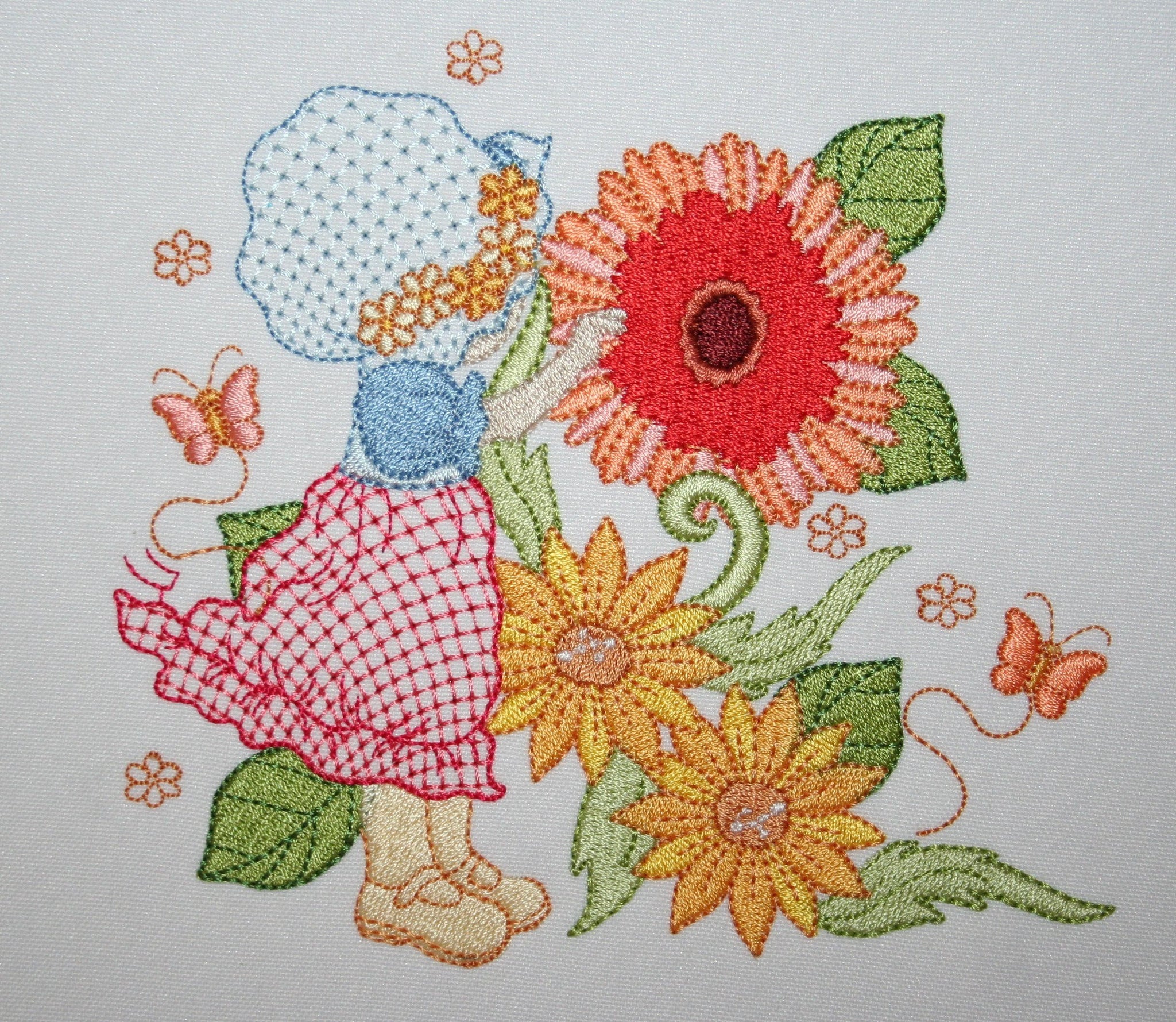 Bonnet Becca enjoys her walk through the garden with gerberas, sunflowers, daisies and beautiful flowers in her pretty lace dress
