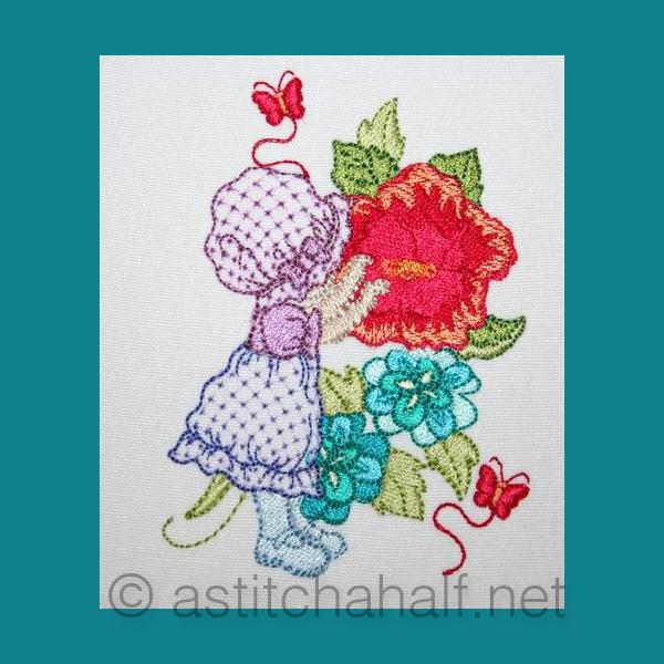 Bonnet Beth enjoys her walk through the garden with lovely flowers in her pretty lace dress. Juts look at the pretty little butterflies and amazing flowers.