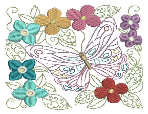 Exquisite Butterfly and Floral arrangement. Embroider on a pocket, fill a corner or add detail to a center piece with this colorful embroidery design.