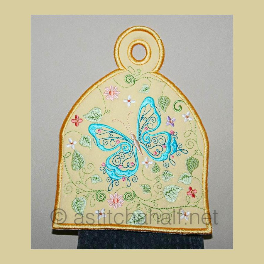 Hang your Towels on this bright and colorful Butterfly Blue Towel Topper. An easy all-in-the-hoop project to complete in a jiffy. Match the flowers to your own color scheme and it will compliment any room.