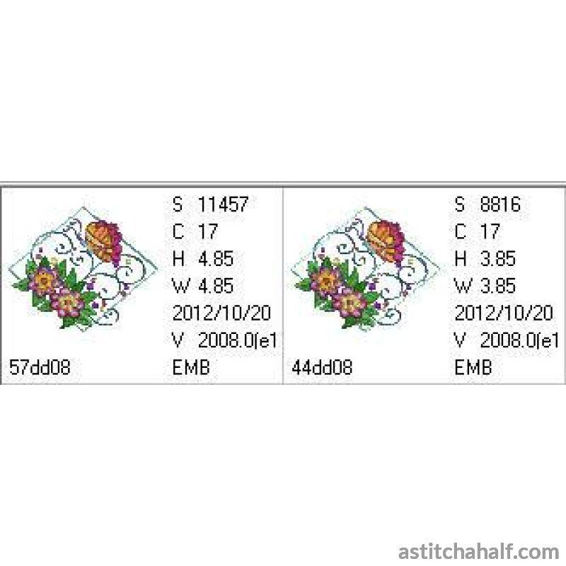 Embroider this colorful Butterfly and flowers design on each corner of a table cloth and compliment with matching napkins. A pretty embroidery design to enhance a pocket or sweat shirt.