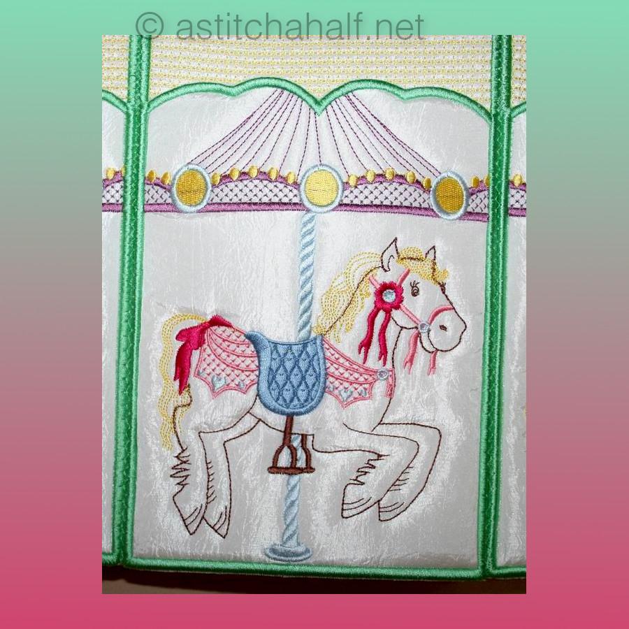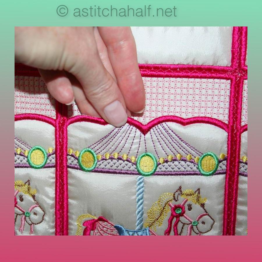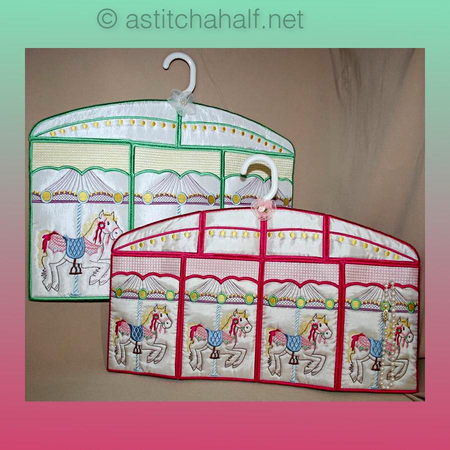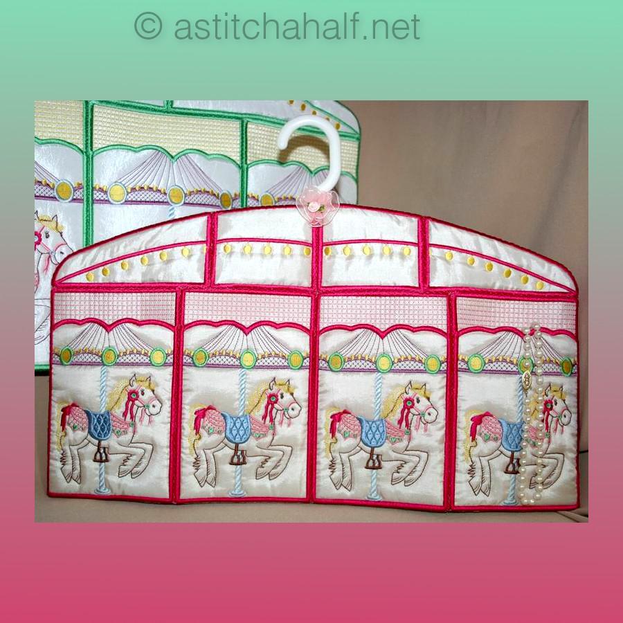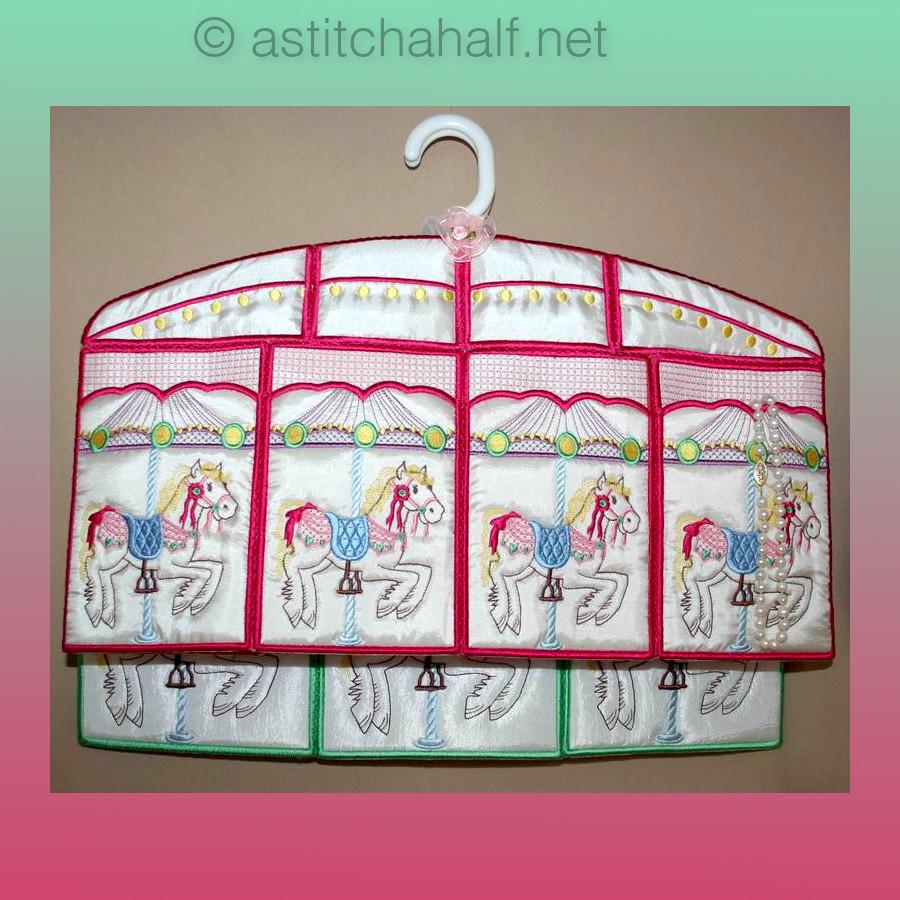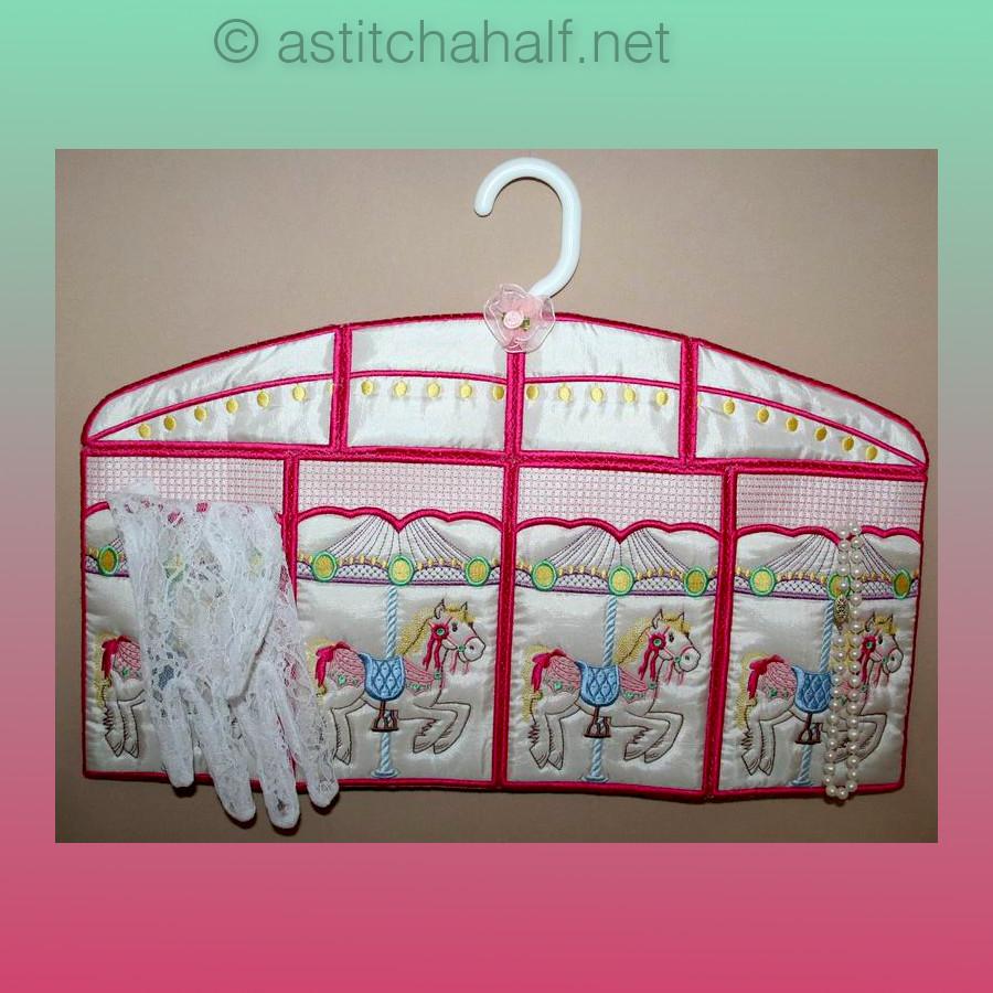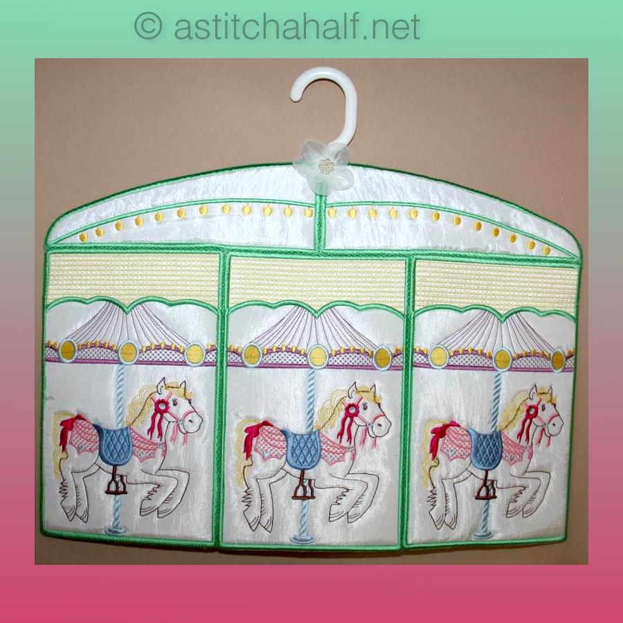 Shoes, hairdryer etc will easily fit in the large pockets of the Carousel Closet Organizer. The Carousel horses make a beautiful decoration. Ideal for a girls room.