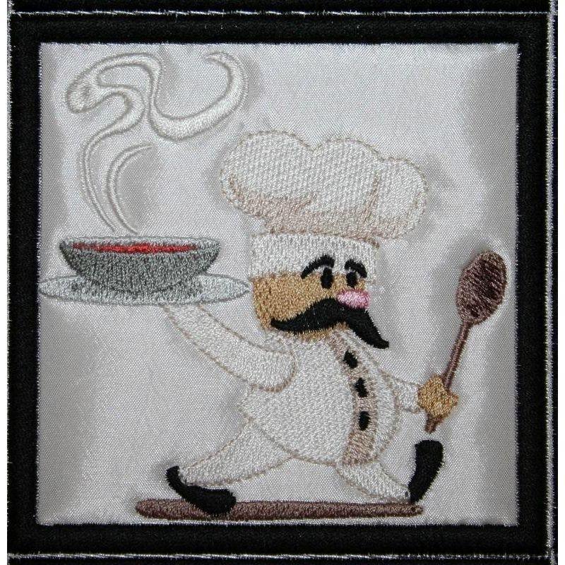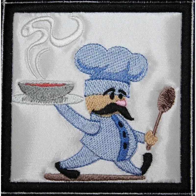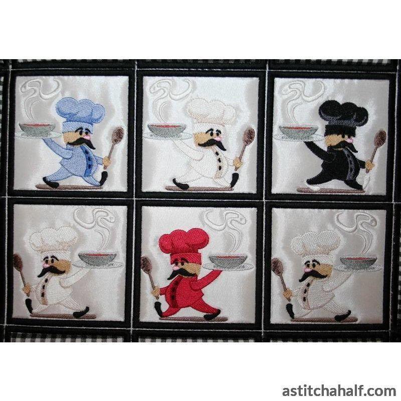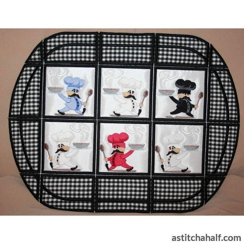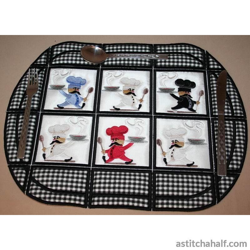 Make a complete set of place mats for your next lunch. And in this collection you have "four chefs" busy with their favorite dishes. And using different colors can create a colorful project.