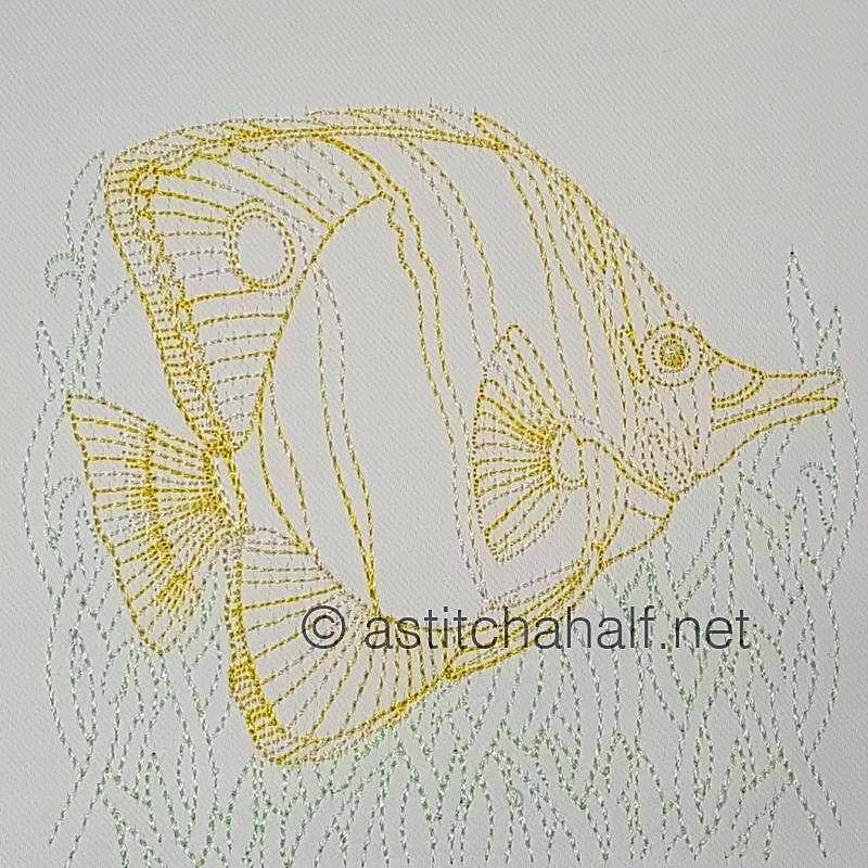 We use variegated thread in this Simple yet Beautiful Copperband Butterfly Fish, which worked well to create depth in the design.You receive 2 designs. 1 x 5*5 hoop, Stitch Count 71371 x 8*8 hoop, Stitch Count 10,102