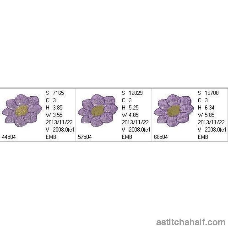Light and transparent flowers created with a just a few flowing stitches. Create a sheer look by stitching these flowers in the color chart provided or embroider in tone on tone to match your fabric. The low stitch count make this perfect to embellish a large number of garments.