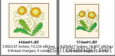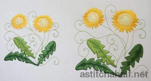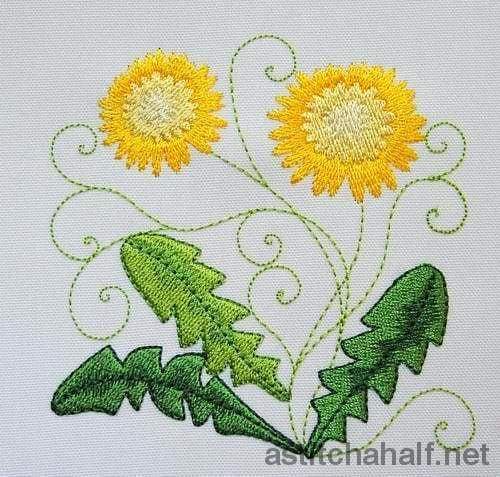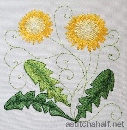 Brighten up your favorite item with this beautiful dandelion flowery design. Make a summer table cloth with matching napkins, even the pockets on a denim or summer`s shirt will look bright and colorful!