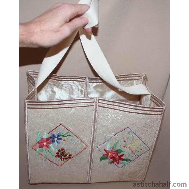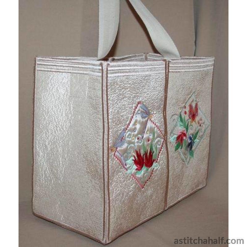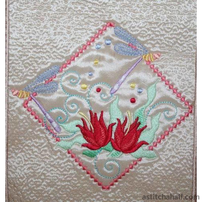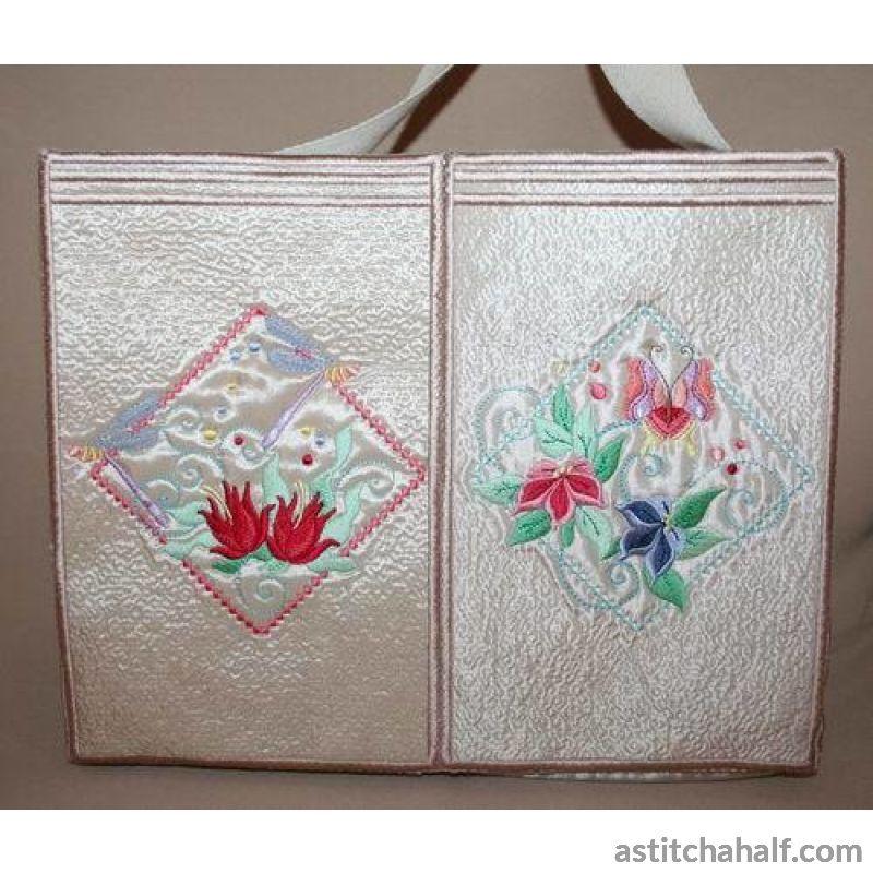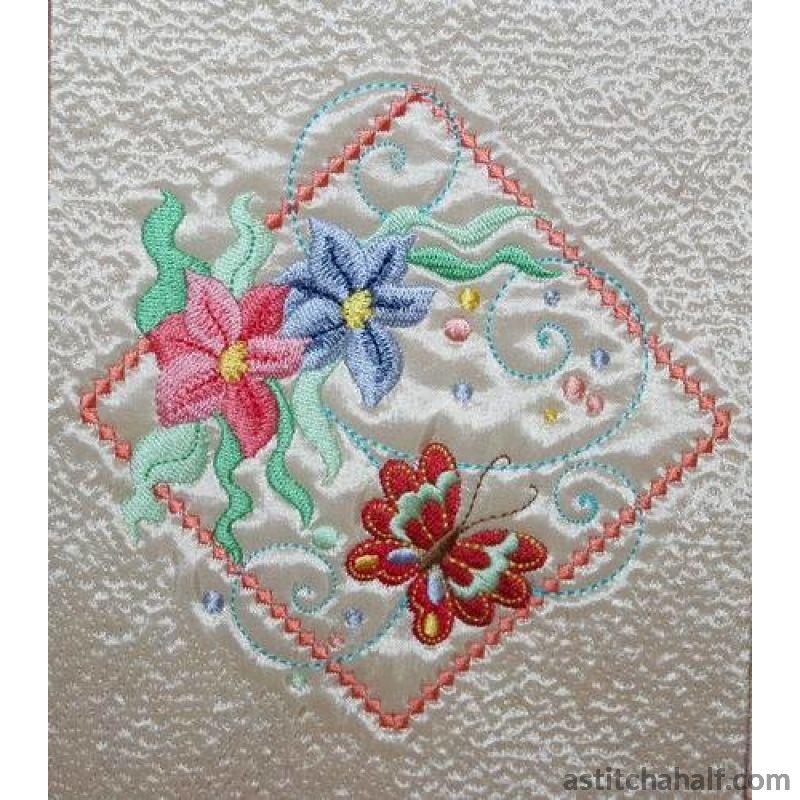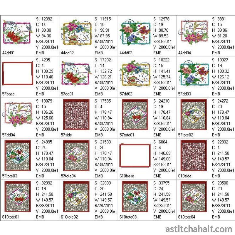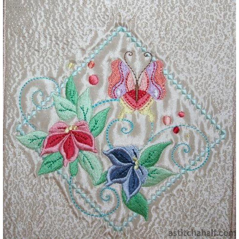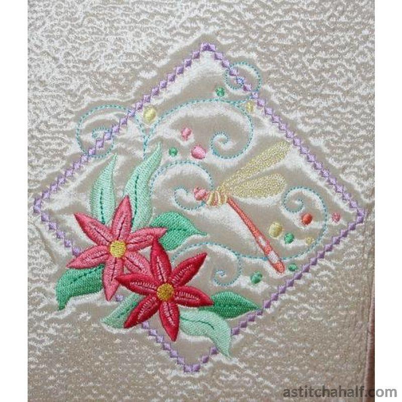 Embroider dragonflies and butterflies framed in beautiful diamond shapes with bright sunny florals to complete your project, garment or home decore accessories. You also receive a Tote Bag FREE for the 5*7 and 6*10 hoop!
