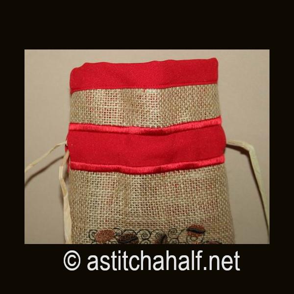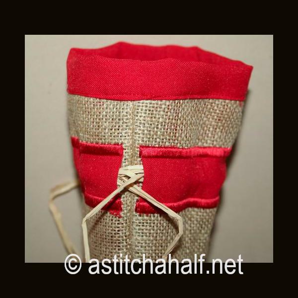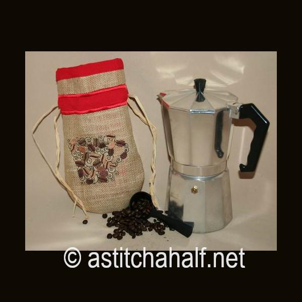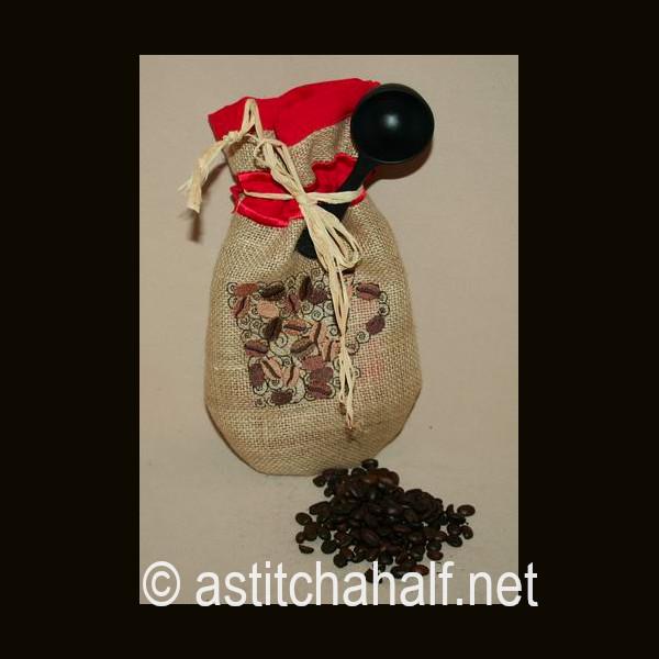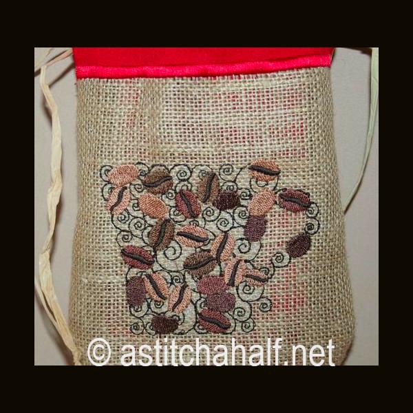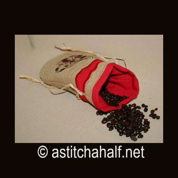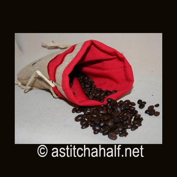 Embroider a drawstring bag on burlap or hessian with a beautiful contrast fabric. Fill with coffee beans, add a spoon and you have a unique gift for a man or woman who loves their cup of coffee. I used raffia as string but you can use ribbon or any cord to match your fabric.