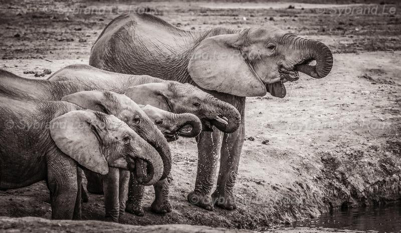Herd of elephants drinking water at waterhole in Addo Elephant National Park, South Africa.