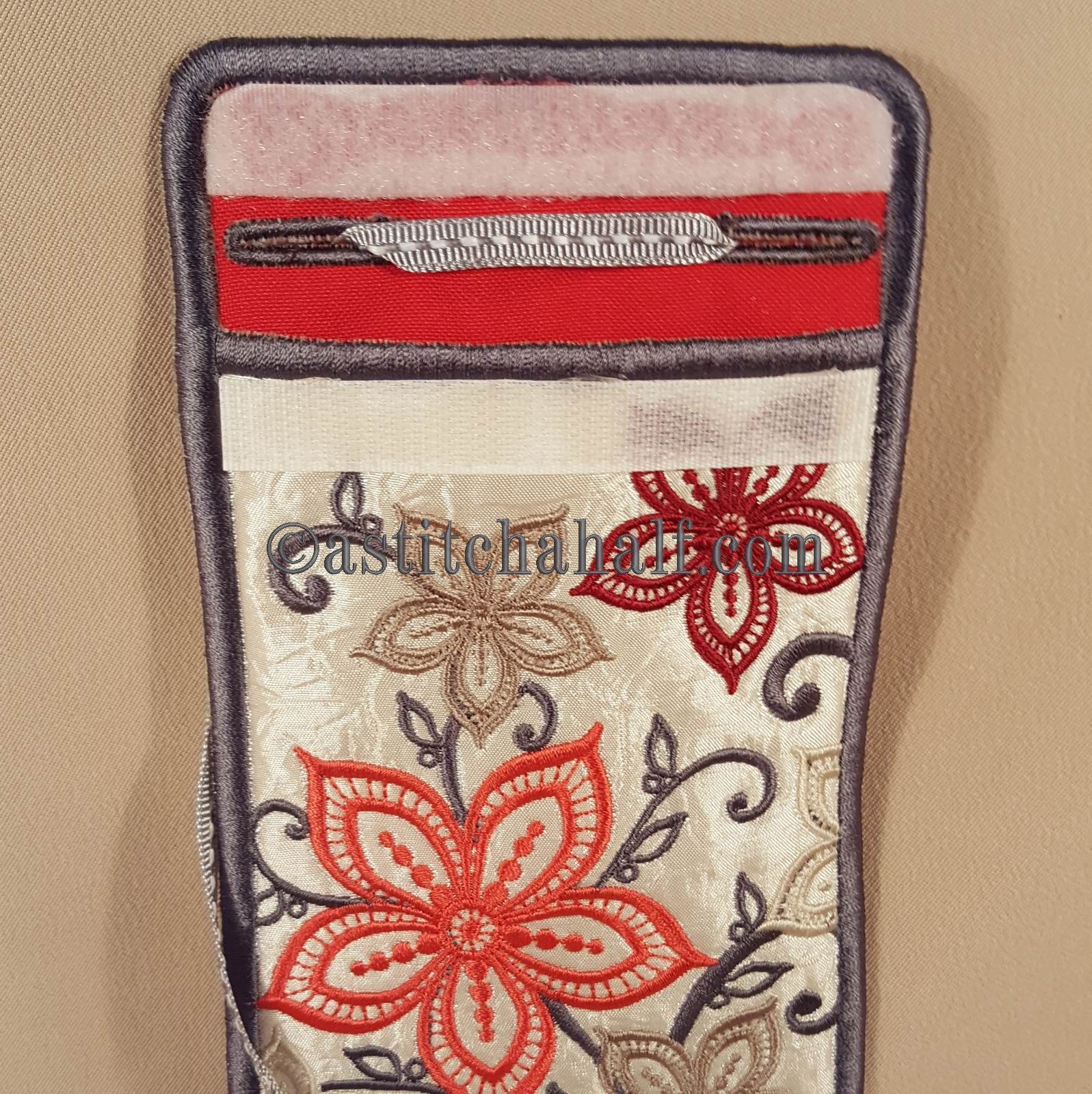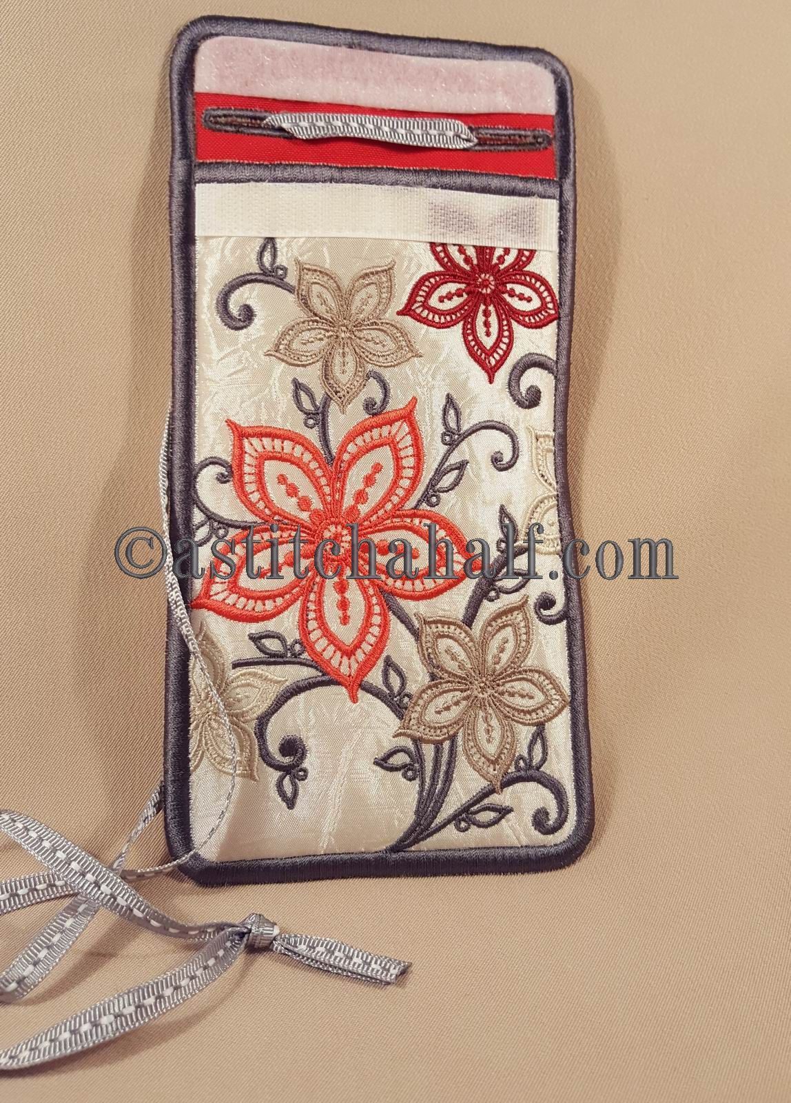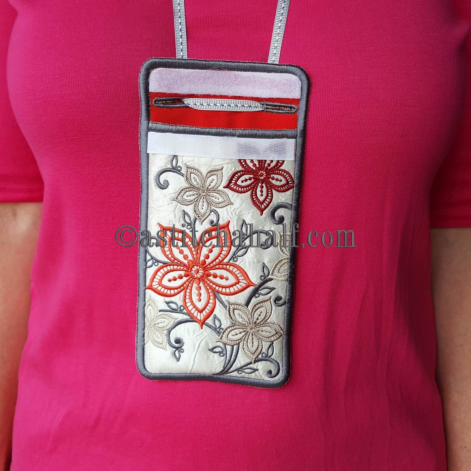 This lovely Cellphone Holder has a narrow overlapping flap. A "velcro" strip allows you to close the holder, so your cellphone cannot fall out. Two buttonholes will also be stitched "in the hoop" to allow you to hang your cellphone holder around your neck. This means you do not need to carry a purse, because even some cash will fit into this lovely holder.