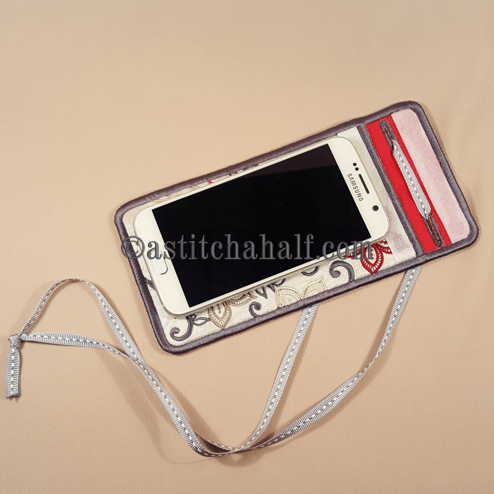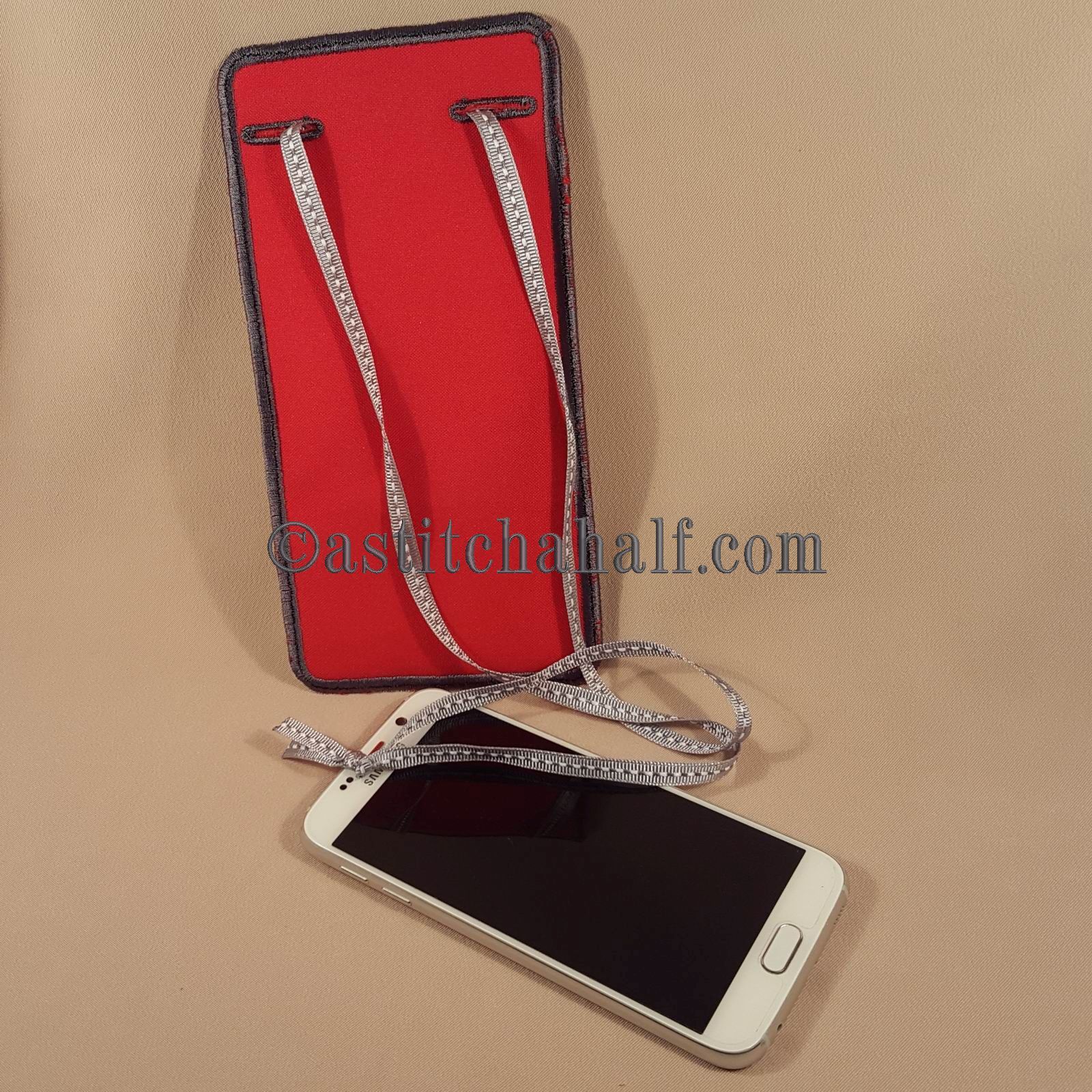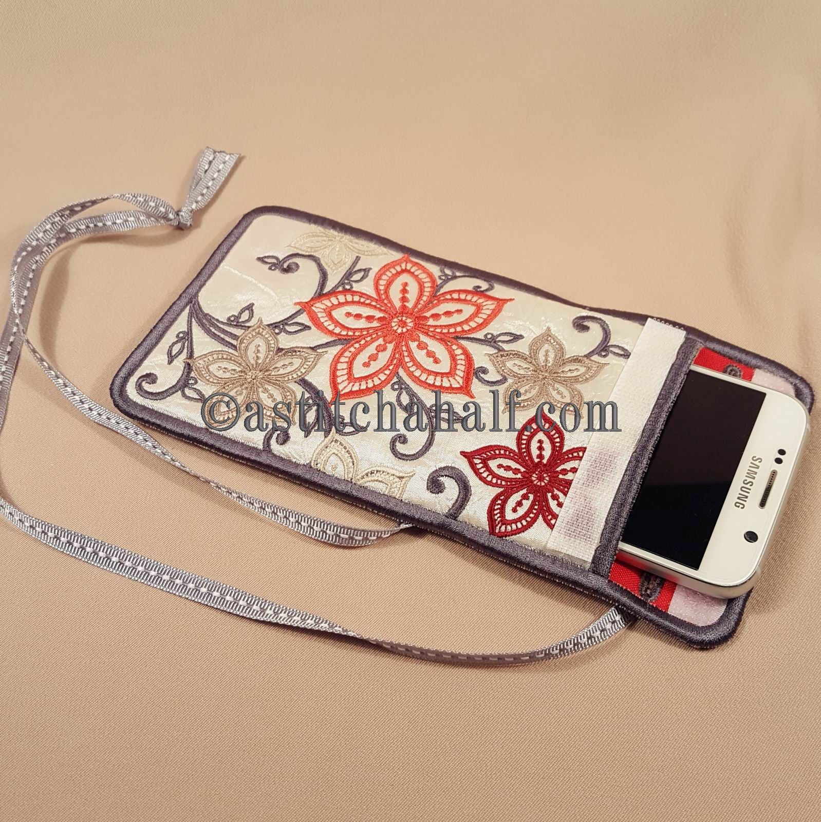 This lovely Cellphone Holder has a narrow overlapping flap. A "velcro" strip allows you to close the holder, so your cellphone cannot fall out. Two buttonholes will also be stitched "in the hoop" to allow you to hang your cellphone holder around your neck. This means you do not need to carry a purse, because even some cash will fit into this lovely holder.
