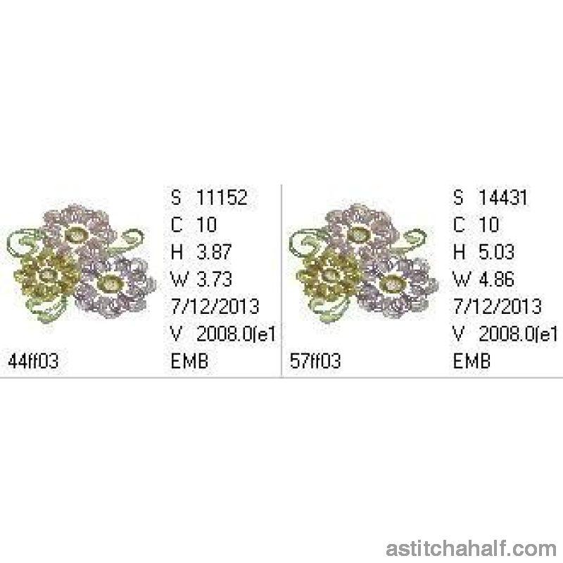 Embroider these 3 pretty flowers in a jiffy. This design has a low stitch count thus ideal to decorate heavy fabric like denim etc