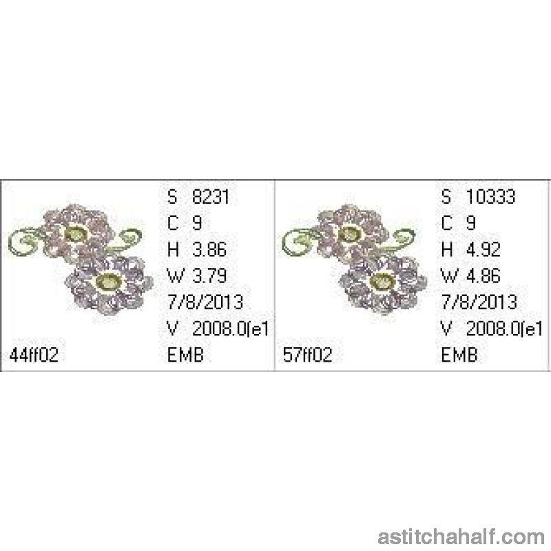 Floral Fluff Twin is a low stitch count flowery design to decorate your favourite item. This design will work well on heavy fabrics like denim.