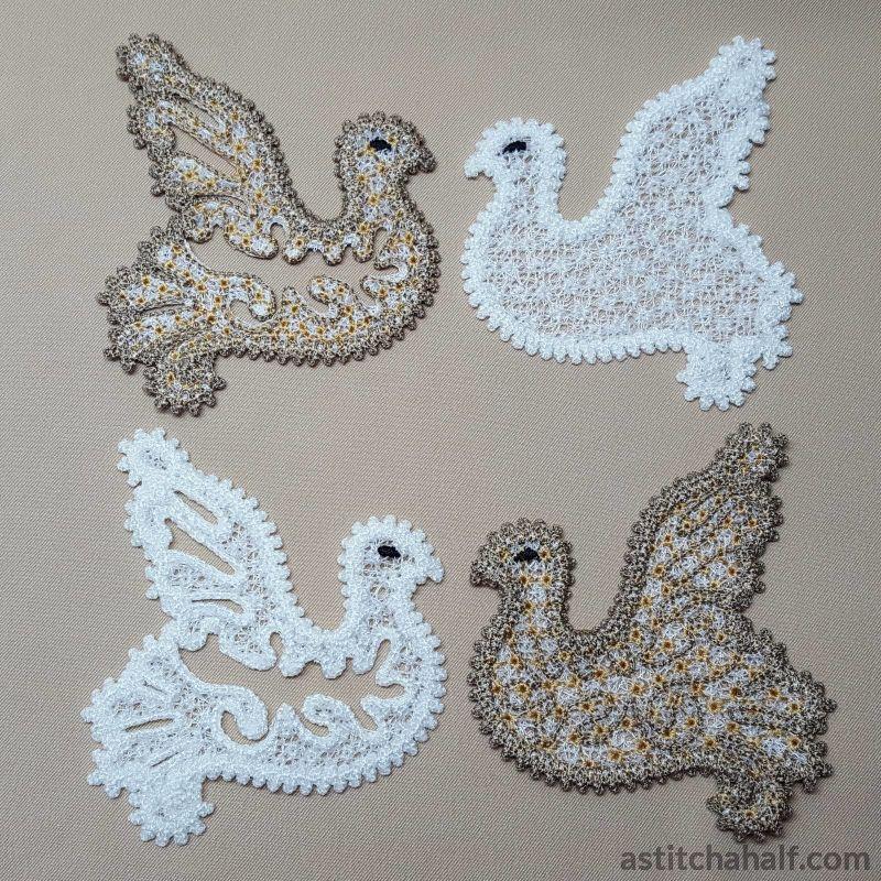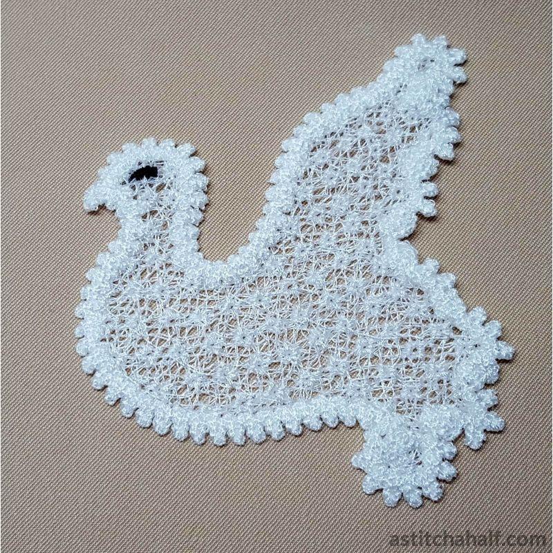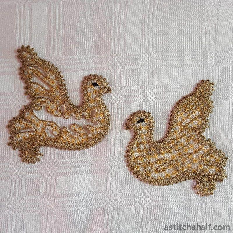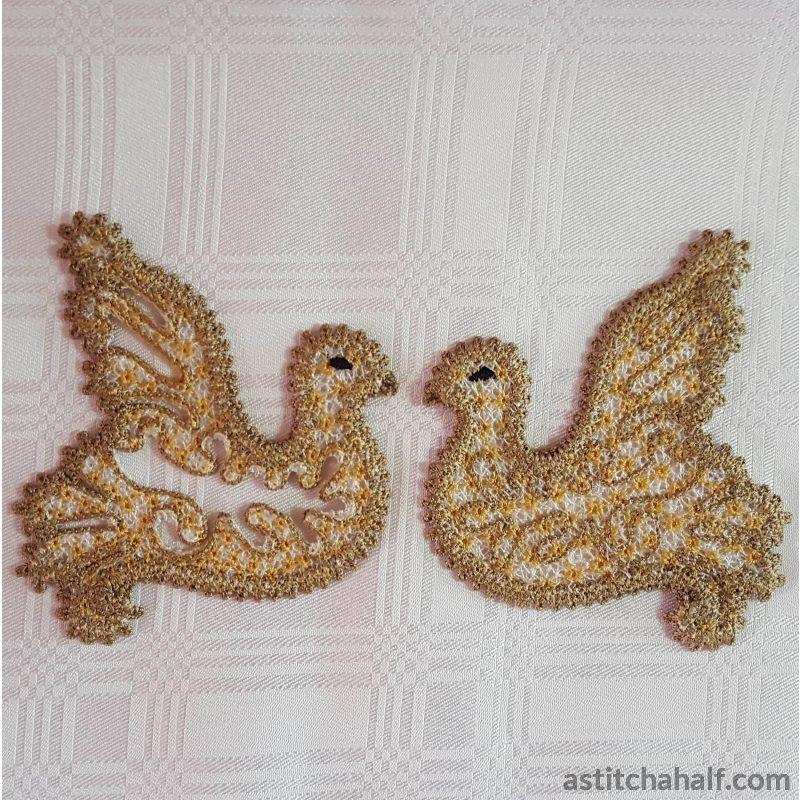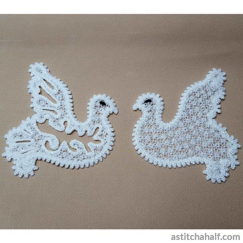 Freestanding Lace Battenberg Doves can be used to create a unique invitation, a napkin ring, decorate your table or simply add to pockets. Enjoy stitching out these simple yet pretty Dove designs.
