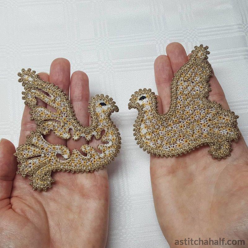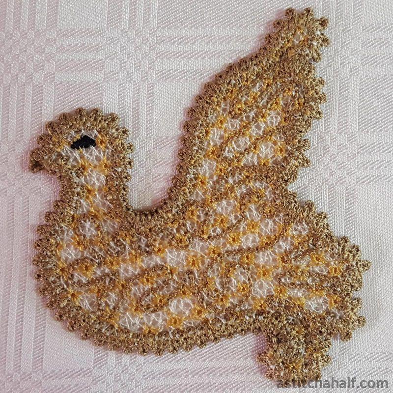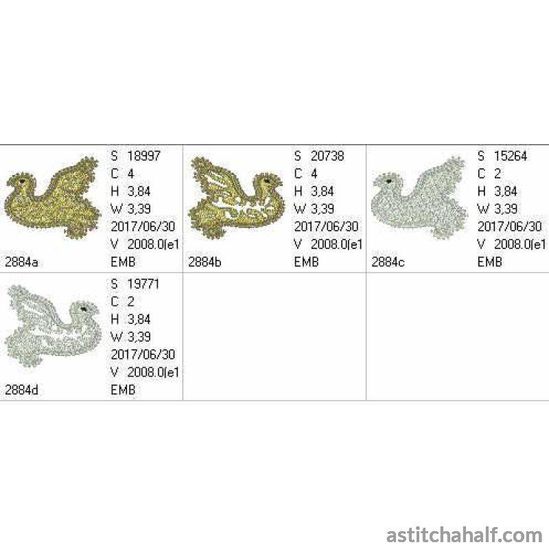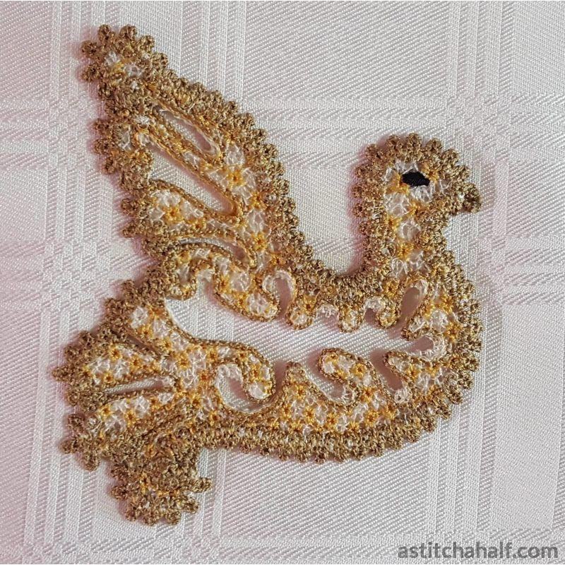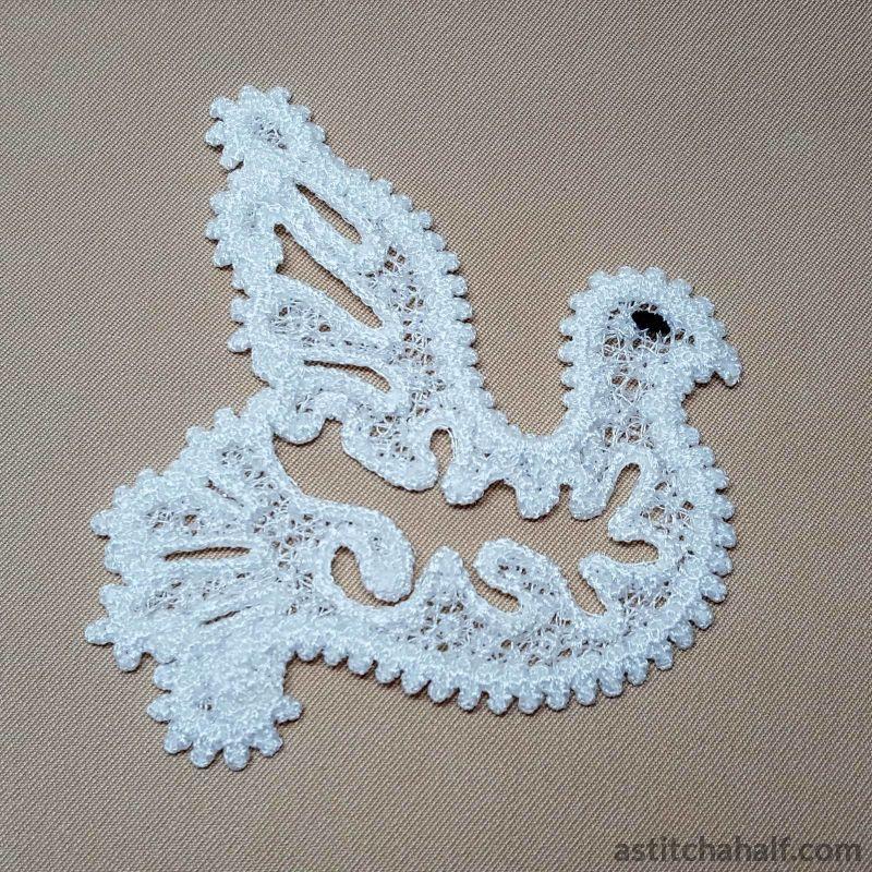 Freestanding Lace Battenberg Doves can be used to create a unique invitation, a napkin ring, decorate your table or simply add to pockets. Enjoy stitching out these simple yet pretty Dove designs.