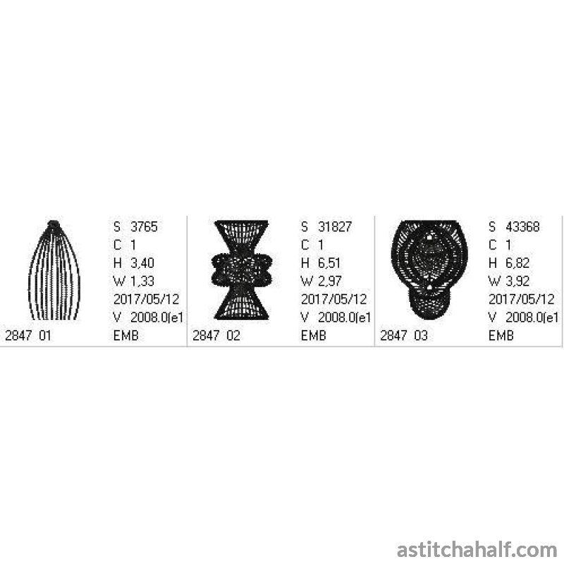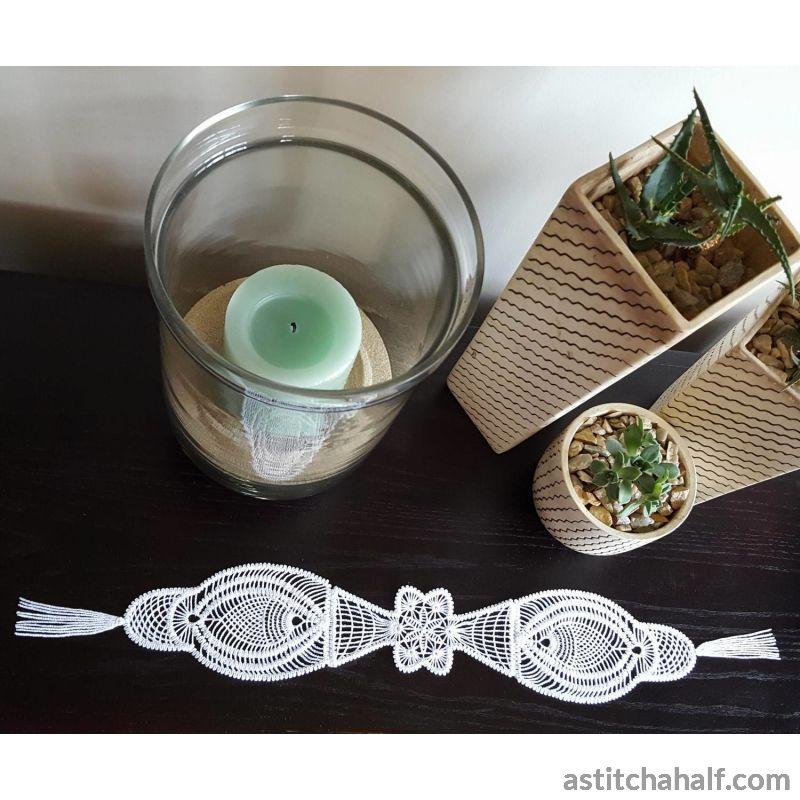 Stitch out 2 x design 1 & 3 and 1 x design 2. Combine with hand stitches or with your sewing machine and your Table Stunner is complete. This project works especially well on narrow shelves like floating shelves.