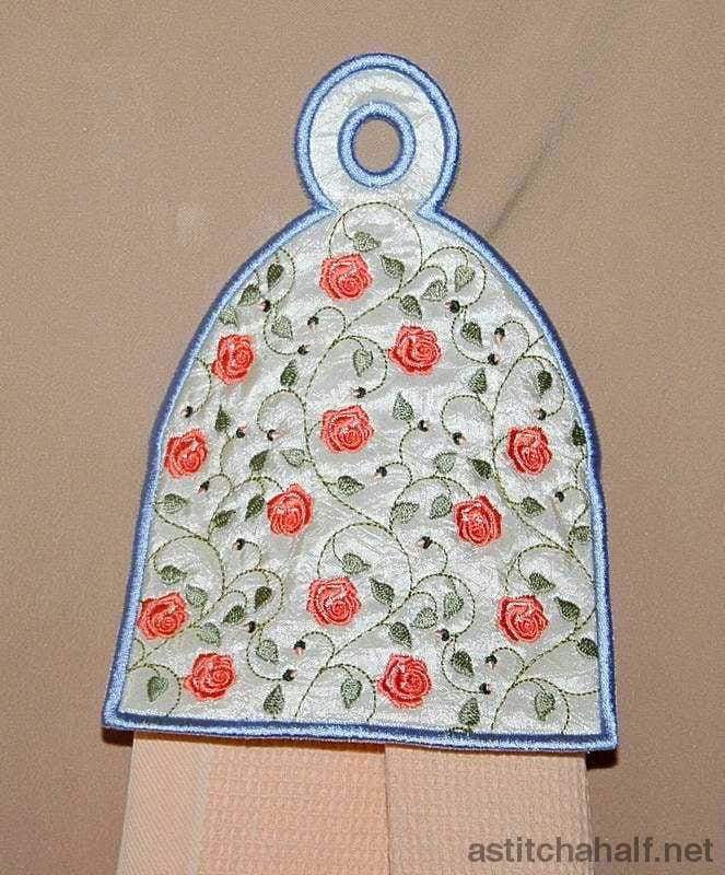 Hang your Towels on this bright and colorful French Rose Towel Toppers. An easy all-in-the-hoop project to complete in a jiffy. Match the flowers to your own color scheme and it will compliment any room.
