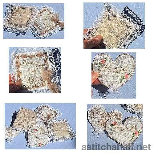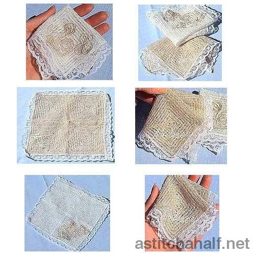 Freestanding Lace designs are so special and exciting to make. With these designs you can create fragrance bags with dried lavender or use these little bags to put your tissues in. Or create dainty freestanding lace handkerchiefs.