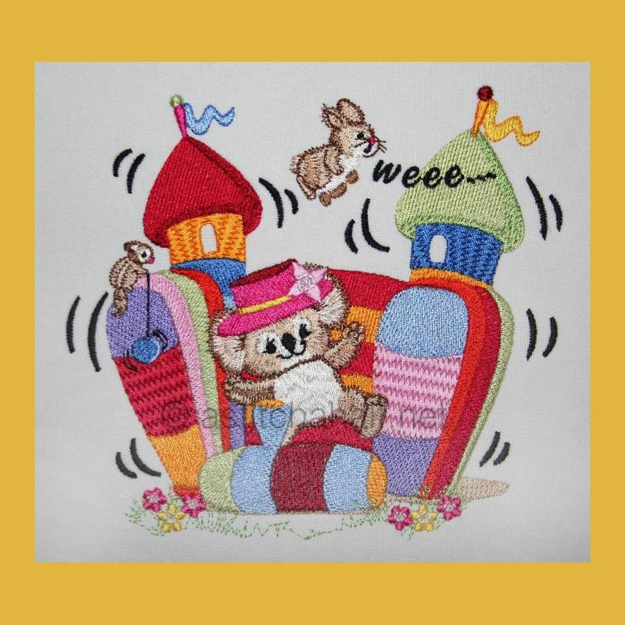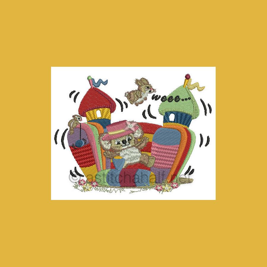 Fuzzy Emma and Bunny are jumping on the jumping castle. Bunny is flying through the air.