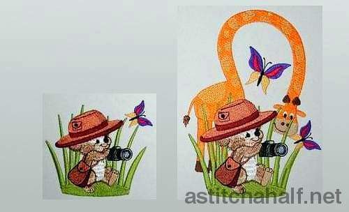 Fuzzy on Safari, taking photos of the giraffe and butterflies.
