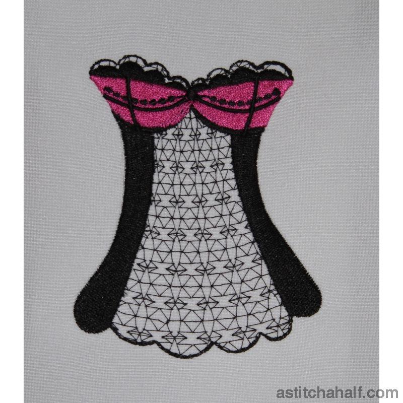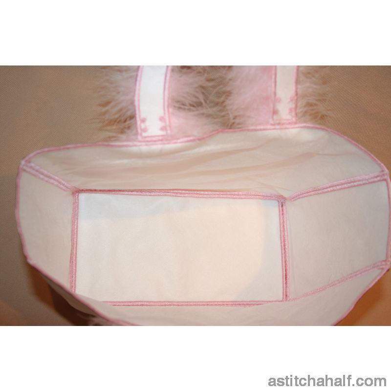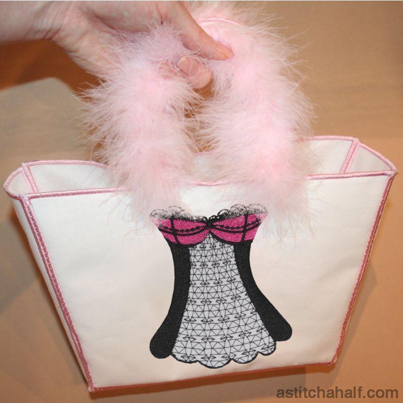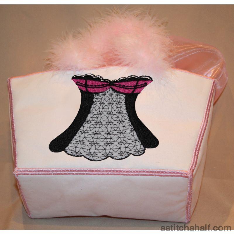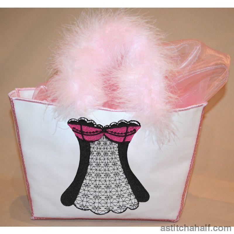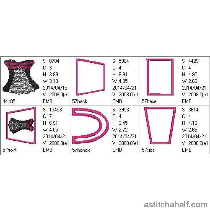 Embroider this delicate and lacy design on a bridal hamper, towel or any girly gift to create a unique and feminine look! Also with this set you can create the Applique Bag. Quick easy and a beautiful bag to keep jewelry or other delicate items in.