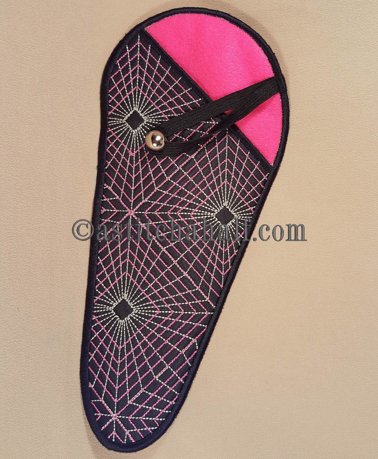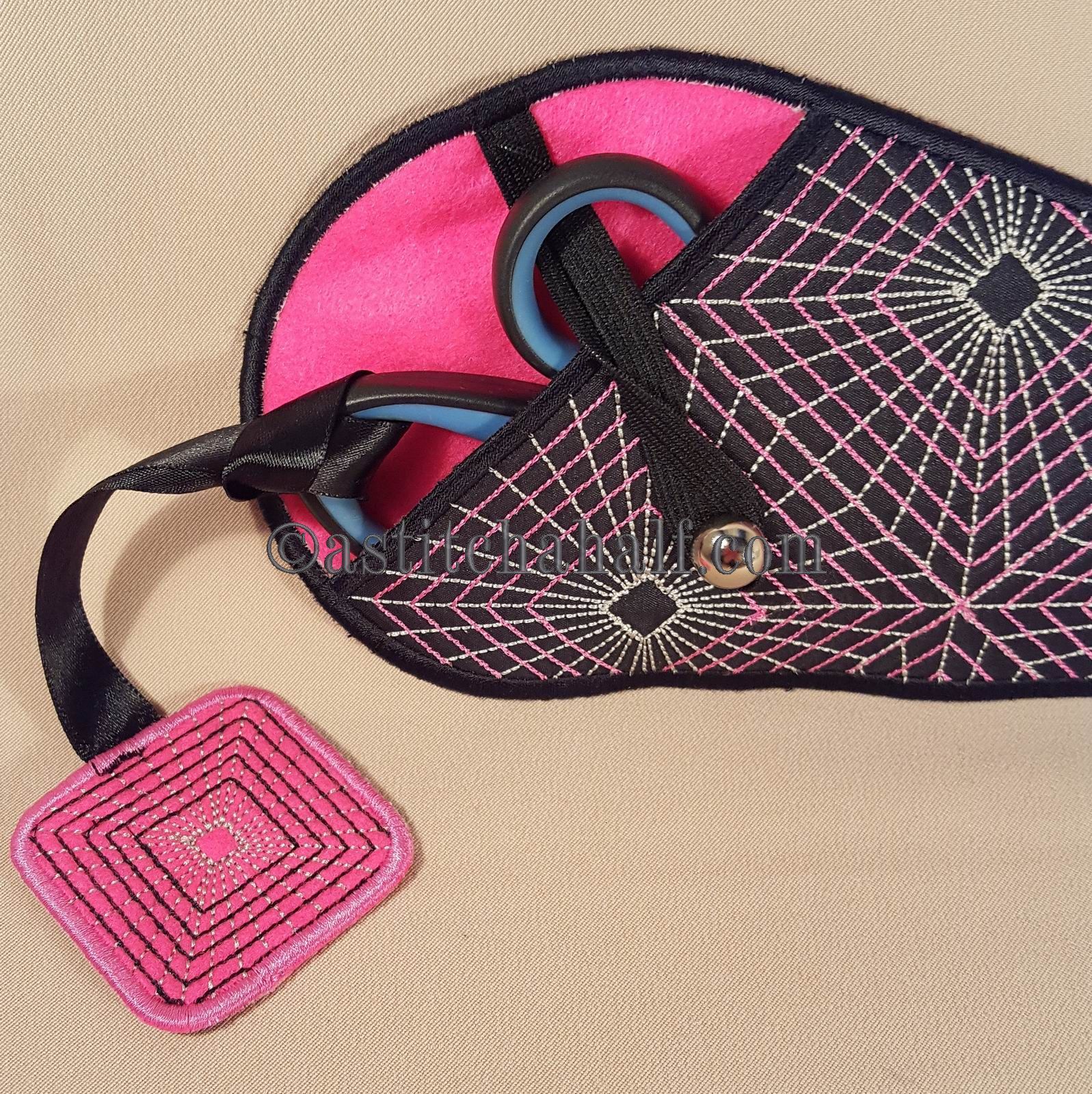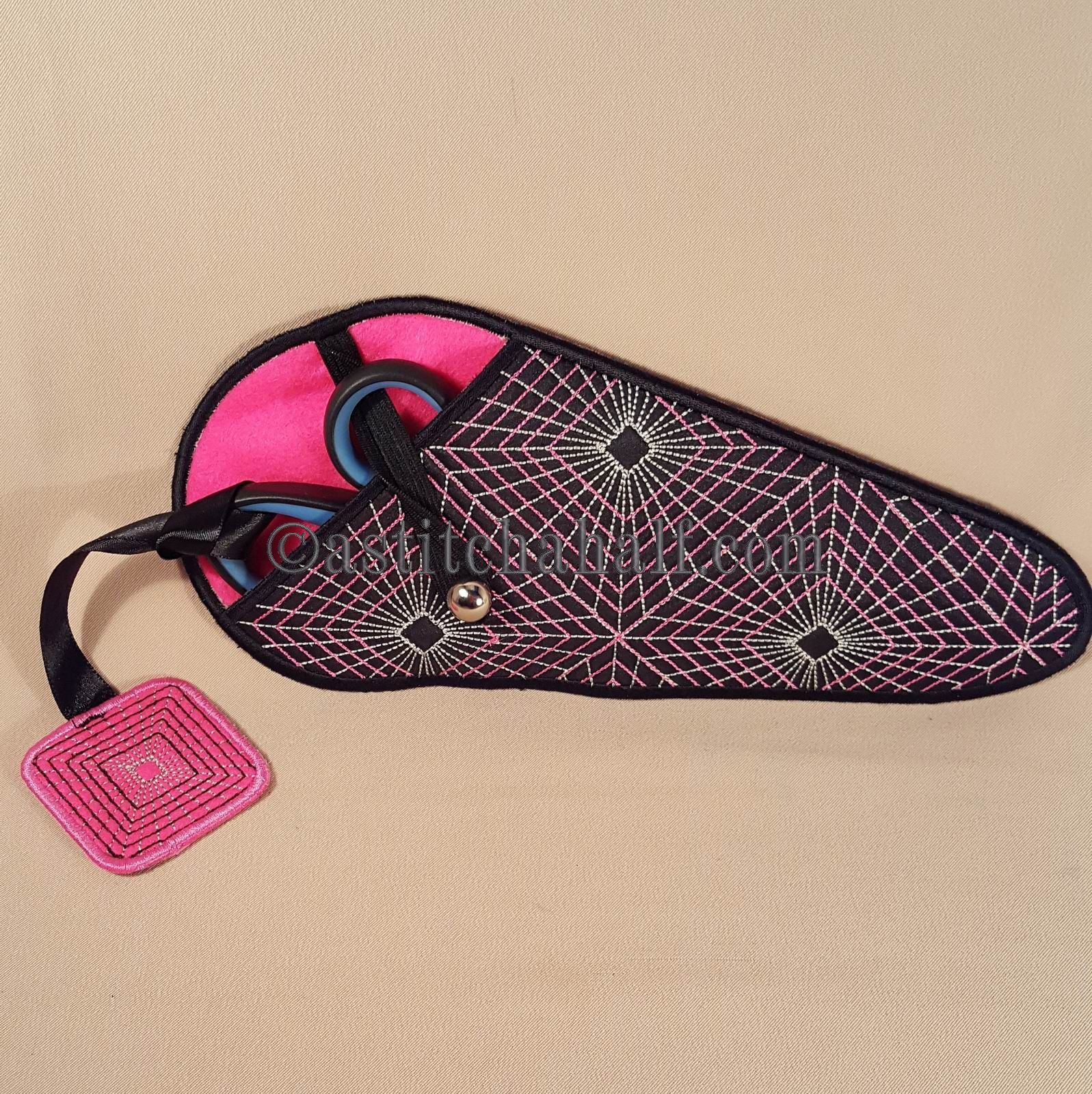 The Gorgeous Geometric Scissor Cases with Fob is a great "in-the-hoop" project, a "must have" for every seamstress and embroidery enthusiast! Fits scissors from small to large. The best feature...Add the matching fob to match your scissors to their Unique Sleeve.