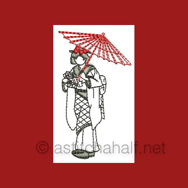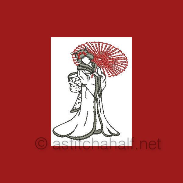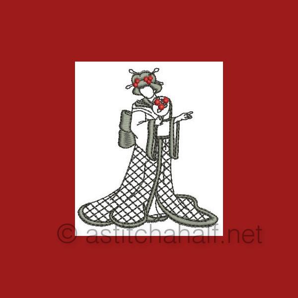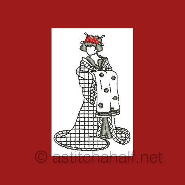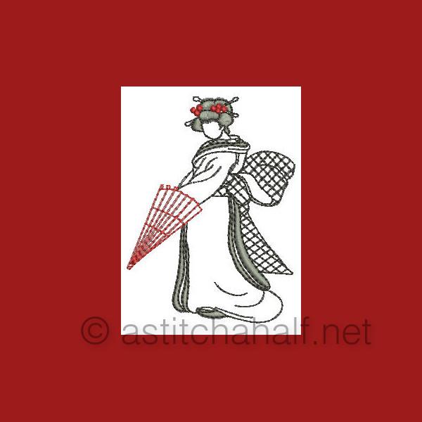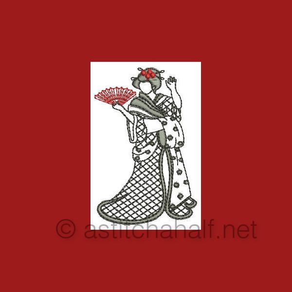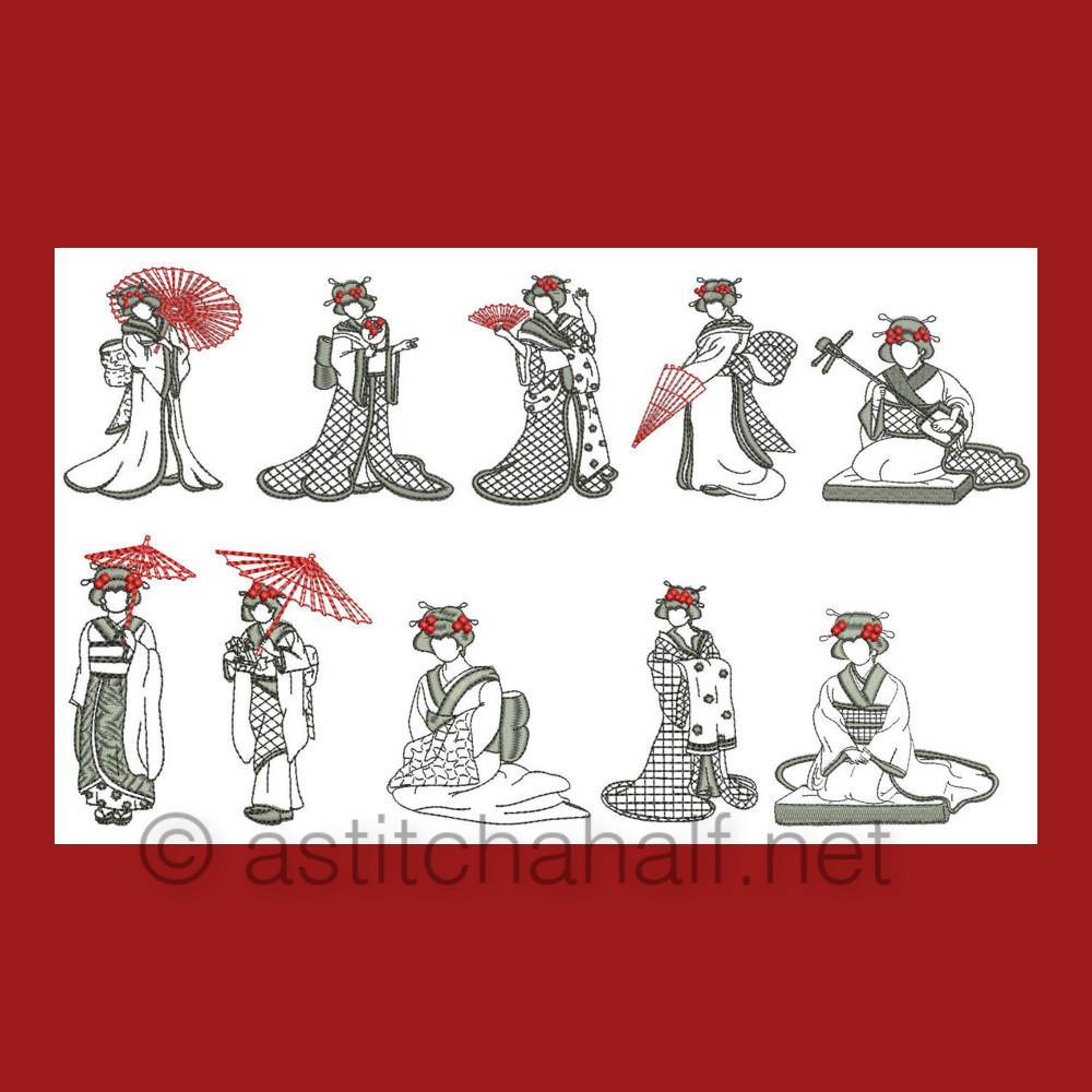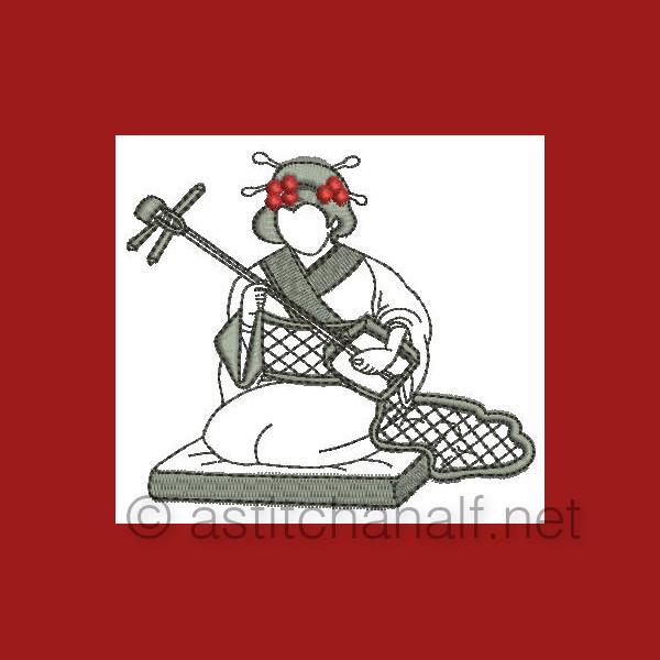 The Gorgeous Japanese Girls is a collection of designs featuring Japanese girls in traditional dress and playing the Shimsen (a traditional stringed instrument). Create beautiful projects with these designs. We made tea tray cloths, pot holders, book covers, coasters, place mats etc.