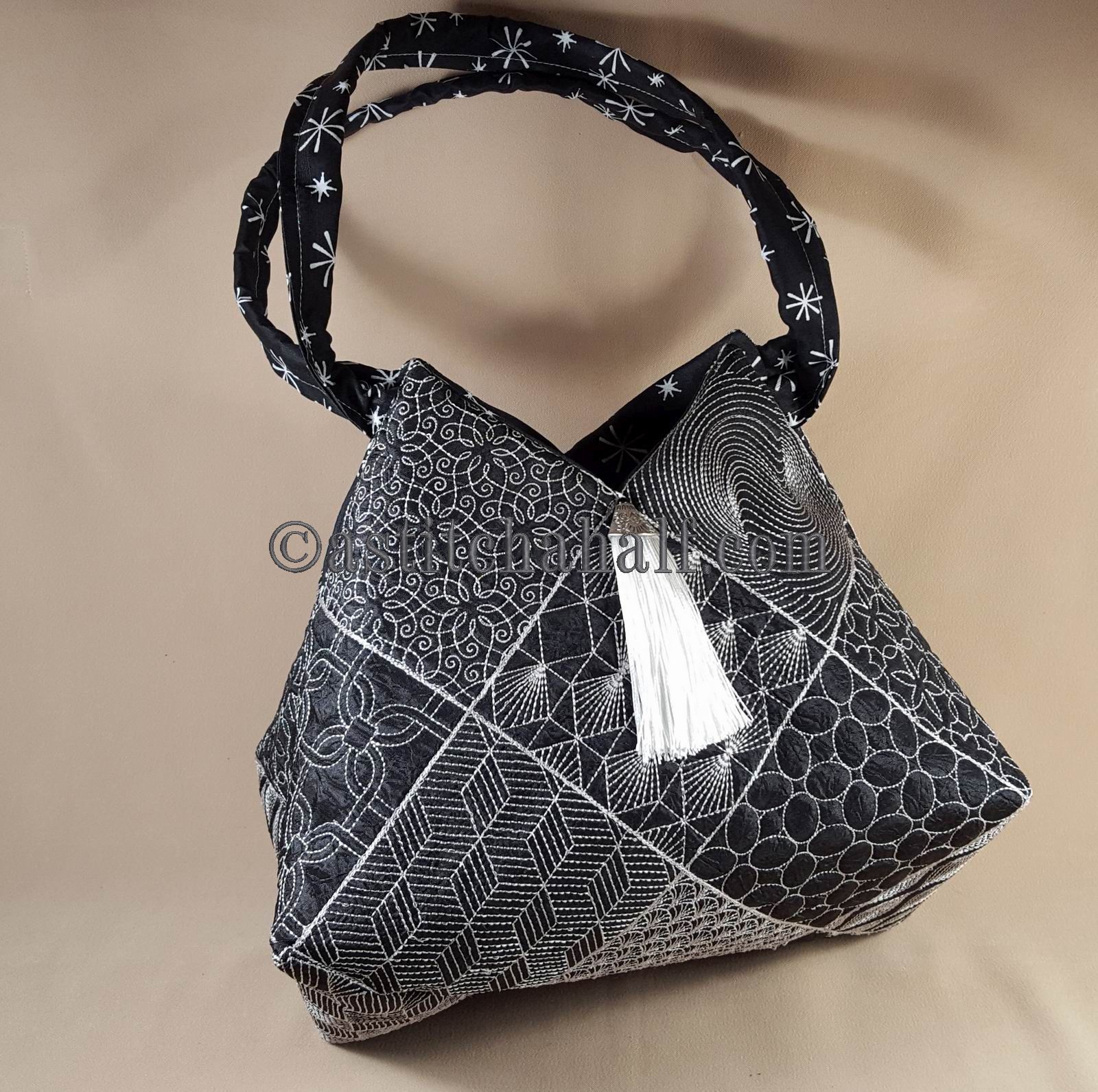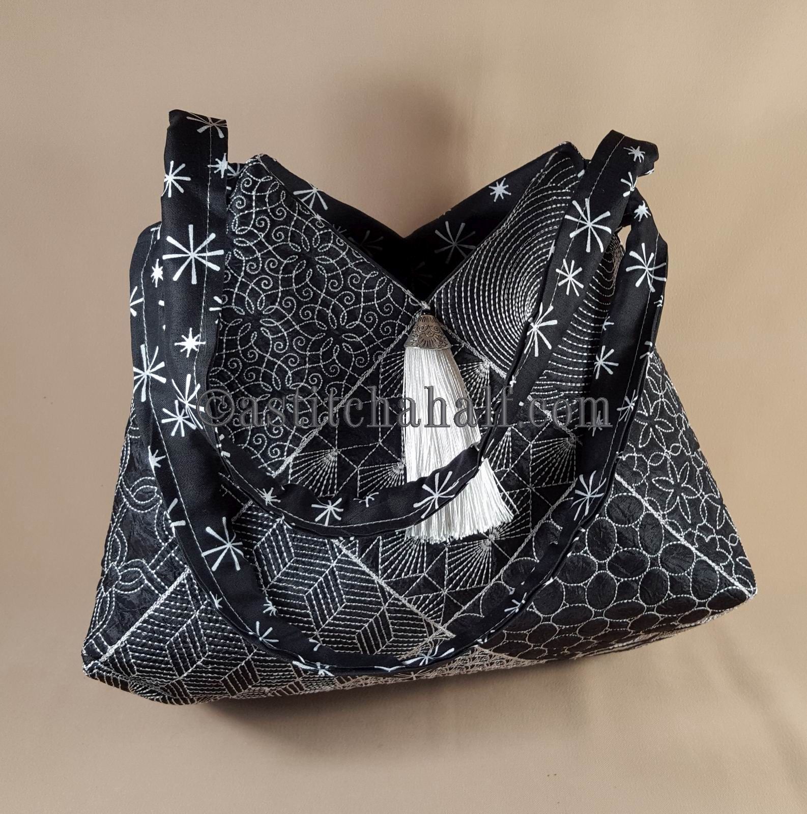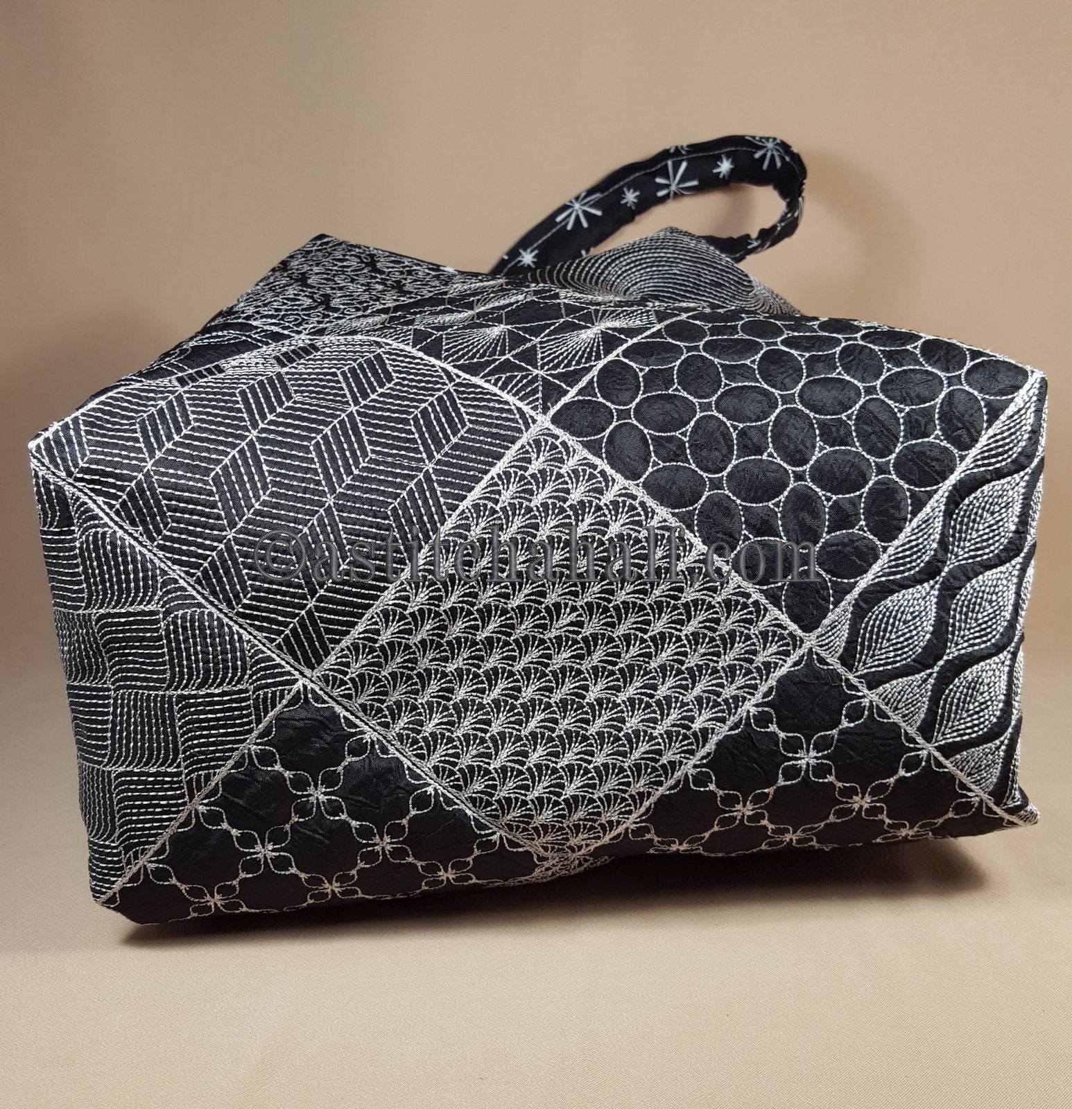 The Tote Bag size will be approx 12" x 13" (4*4 hoop bag) or 14" x 15" (5*5 hoop bag). Use the large Blocks to complete a Beautiful Quilt.