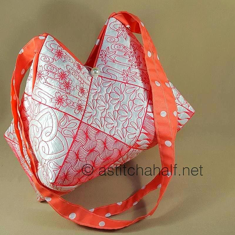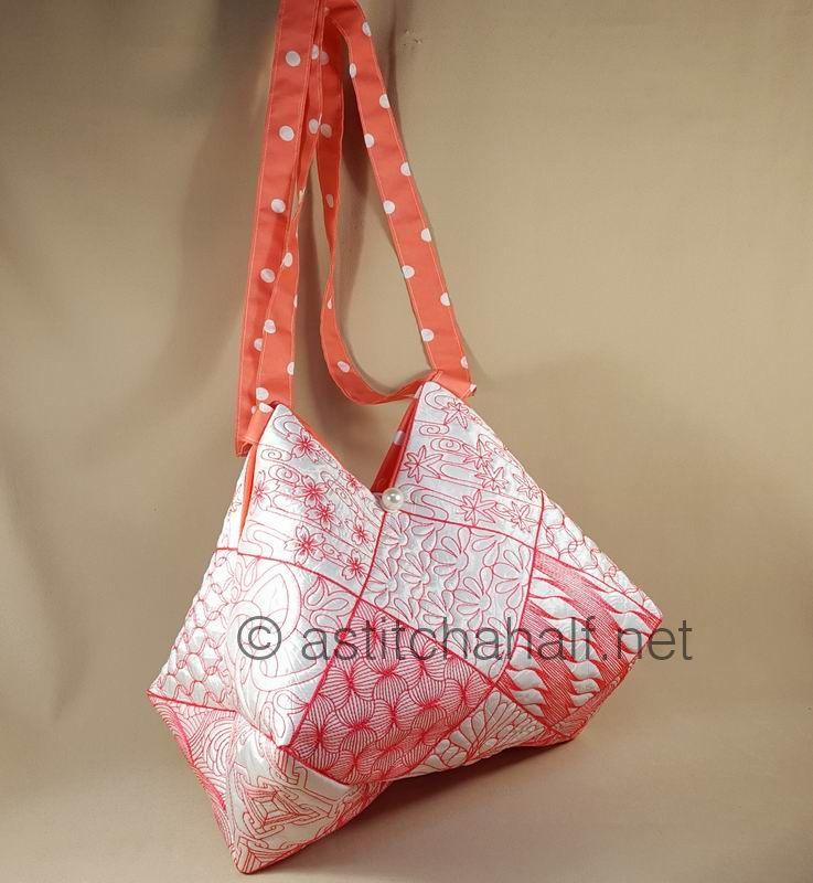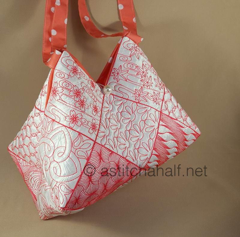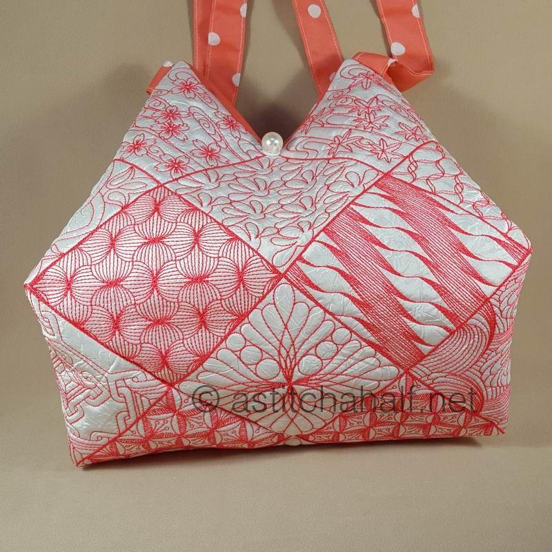 The Tote Bag size will be approx 12" x 13" (4*4 hoop bag) or 14" x 15" (5*5 hoop bag). Use the large Blocks to complete a Beautiful Quilt.