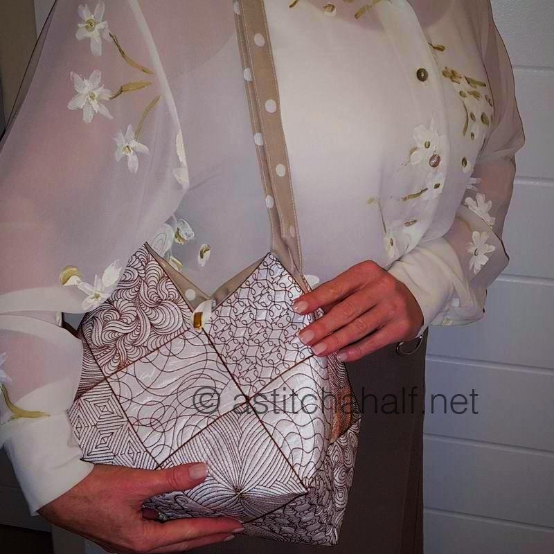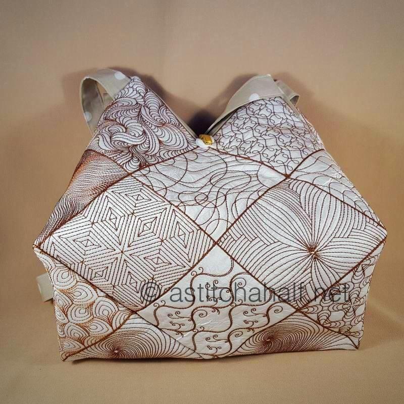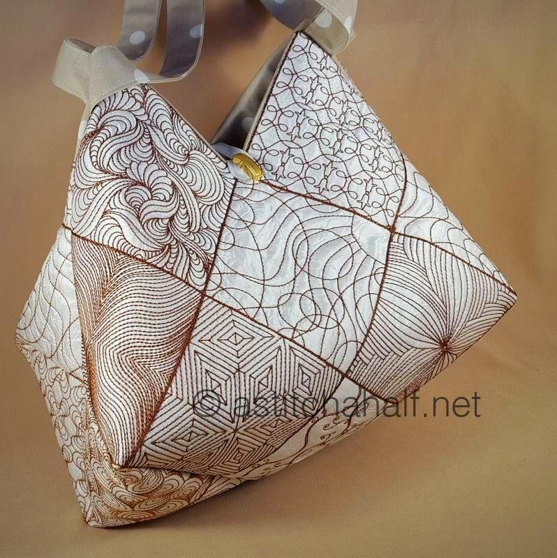 The Tote Bag size will be approx 12" x 13" (4*4 hoop bag) or 14" x 15" (5*5 hoop bag). Use the large Blocks to complete a Beautiful Quilt.
