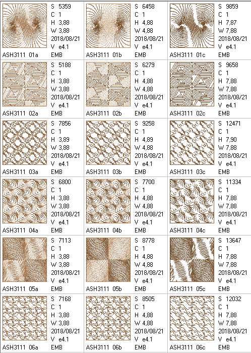 5*5 hoop designs x 11 (stitch count = 4024 - 13,712)