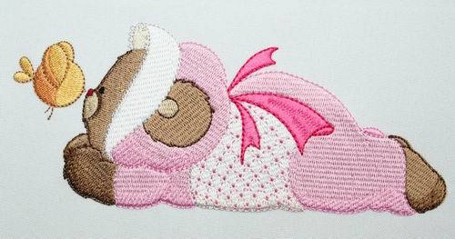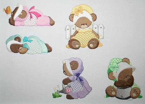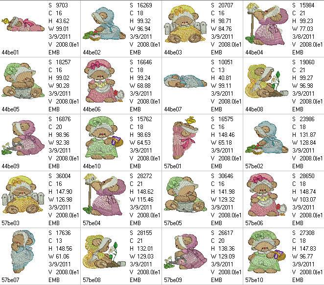 20 Design (10 for the 4*4 hoop and 10 for the 5*7 hoop) 10 x Unique Lucy Bear designs with their lace and bonnet dresses, doing their chores and taking a well deserved nap