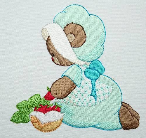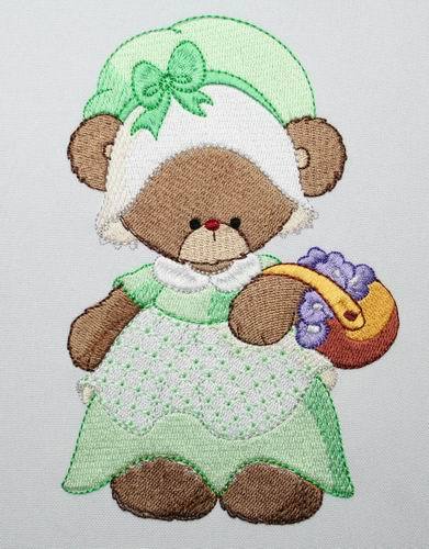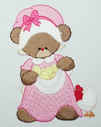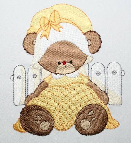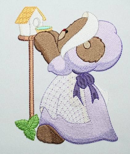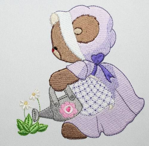 Embroider Lucy Bear designs with their lace and bonnet dresses for young and old on garments and on home decor items. Here Lucy Bear is watering the plants, feeding the birdies, take a nap and clean the picket fence.