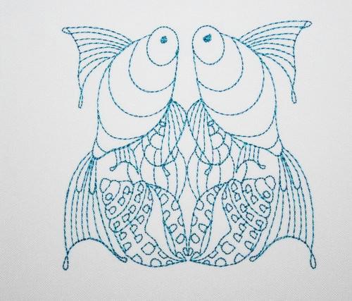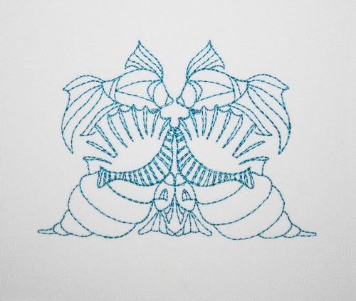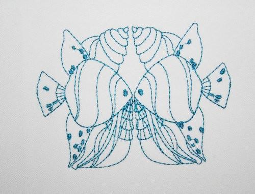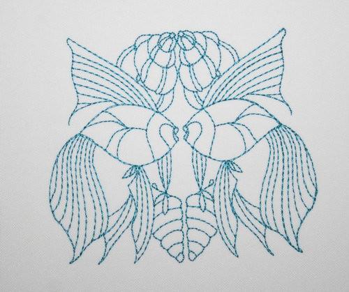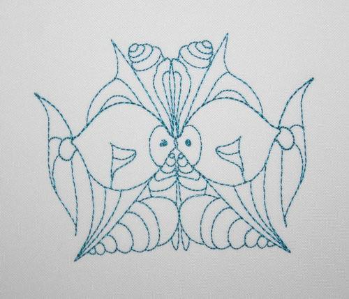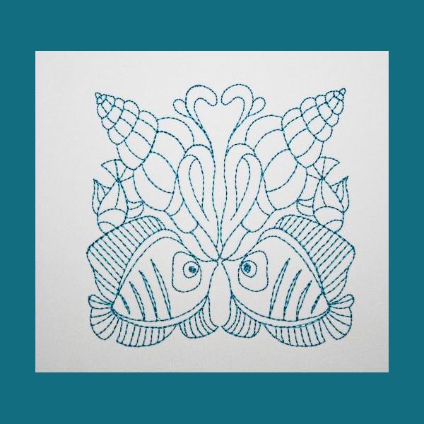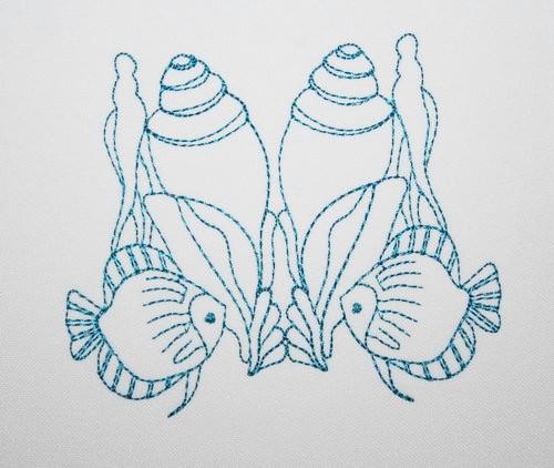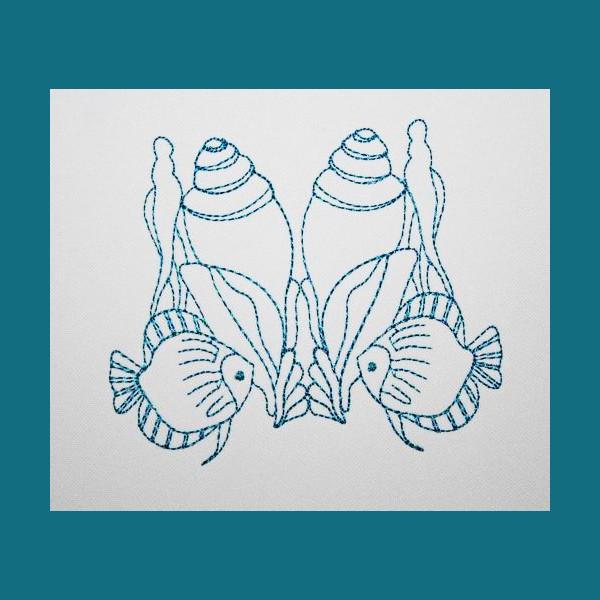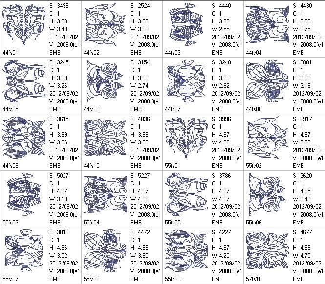 A variety of popular marine animals. fish and sea shells. They are mirror images to make the designs just so much more interesting. They are so popular because they have a low stitch count and stitch out in a jiffy.