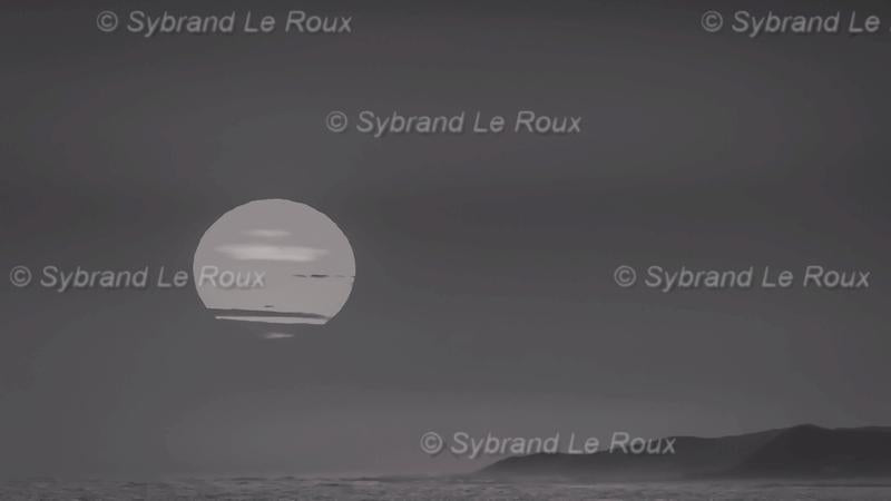 Misty red sunset over the ocean with a purple sky and hazy shoreline.