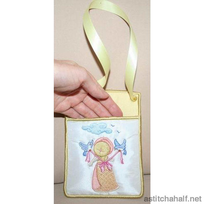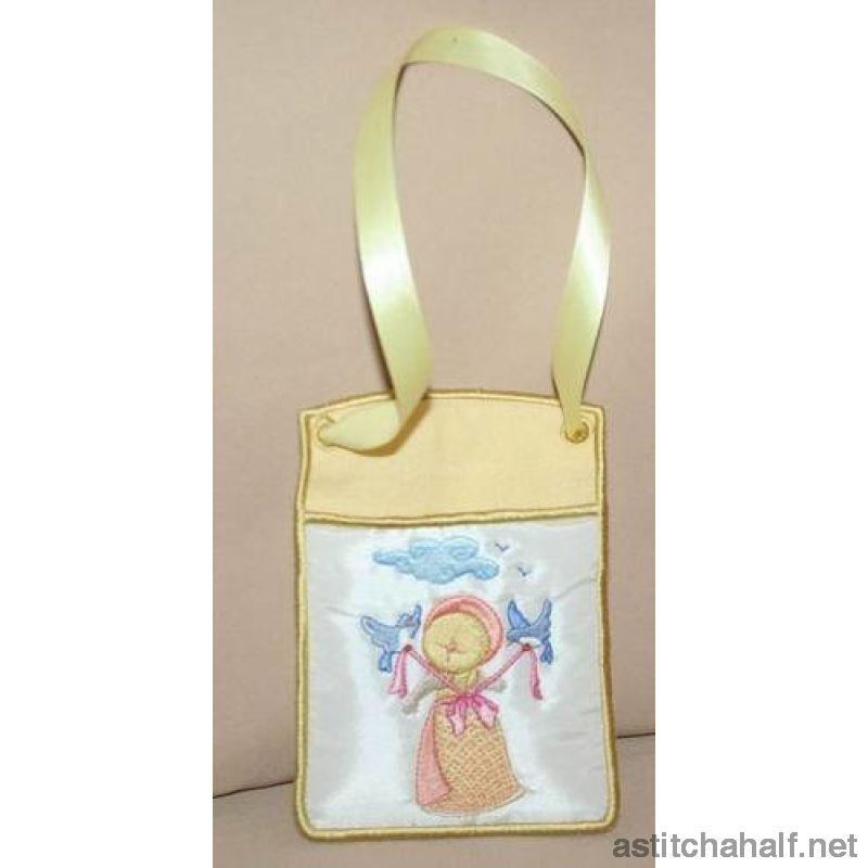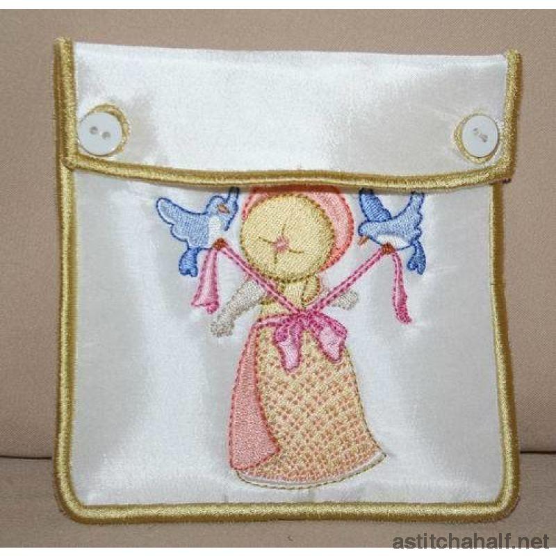 A quick and easy pocket with Sunbonnet Sue in nature to complete for girls to use as a little handbag or school pocket.