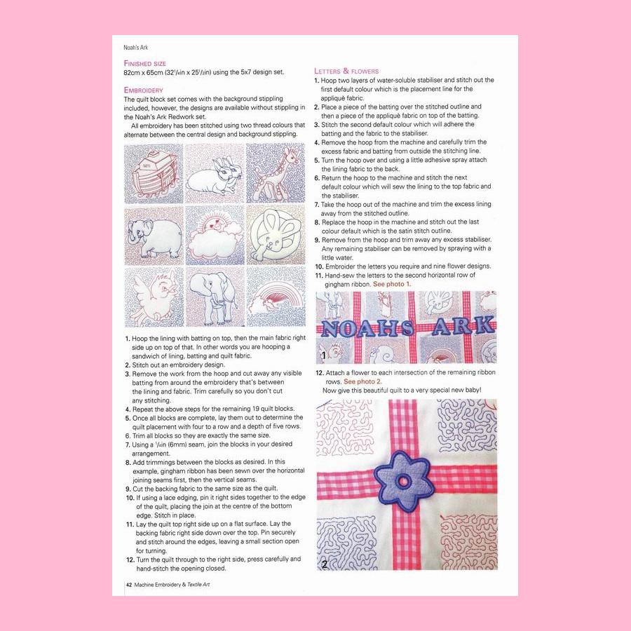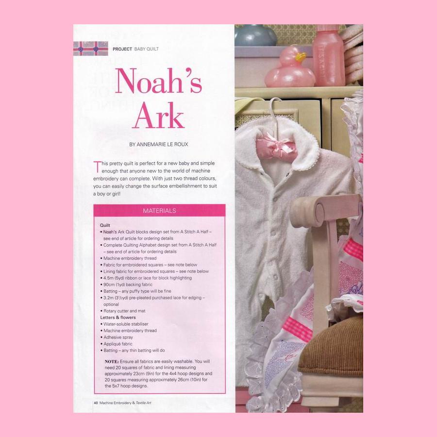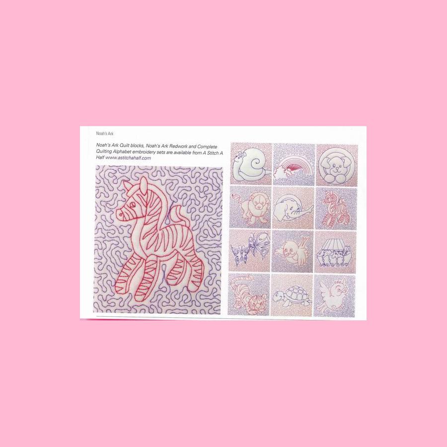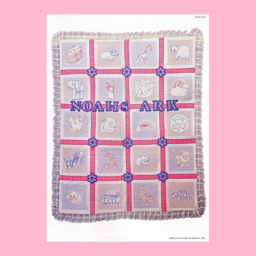 Noah's Ark Trapunto will decorate a quilt and bring joy to your children. Trapunto designs, also called raised embroidery. Create beautiful projects with these designs. We made tea tray cloths, pot holders, book covers, coasters, place mats and off course, this lovely Baby Quilt.