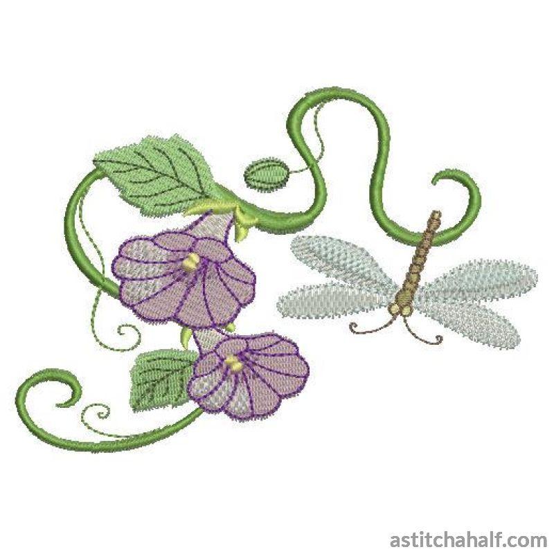 Decorate your towels, tote bag or pockets with this colorful design in Pretty Purple Morning Glory and Firefly
