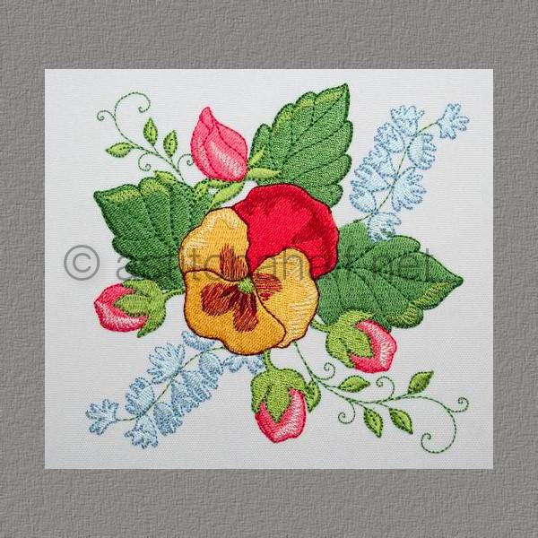 Brighten up a new or used item with this colorful embroidered Princess Pansy design. A summer table cloth with matching napkins, even the pockets on a denim or summer`s shirt will look bright and colorful!