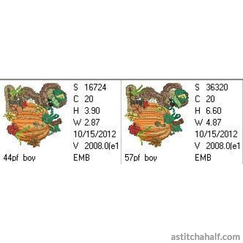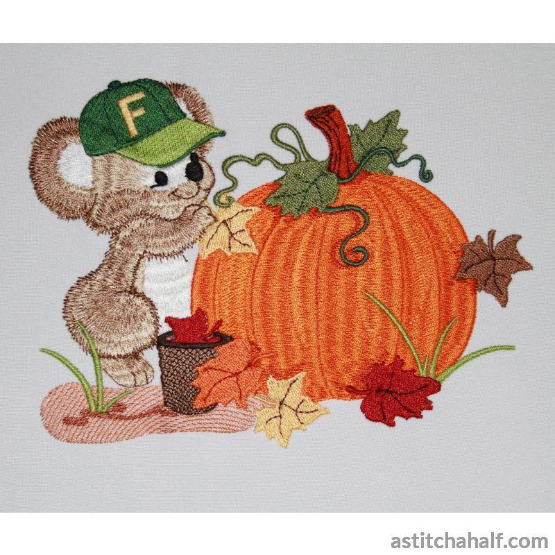 Fuzzy Boy picking pumpkins for the pumpkin pie. This one should be big enough!  Ideal to decorate your apron, dish cloths