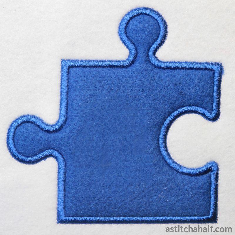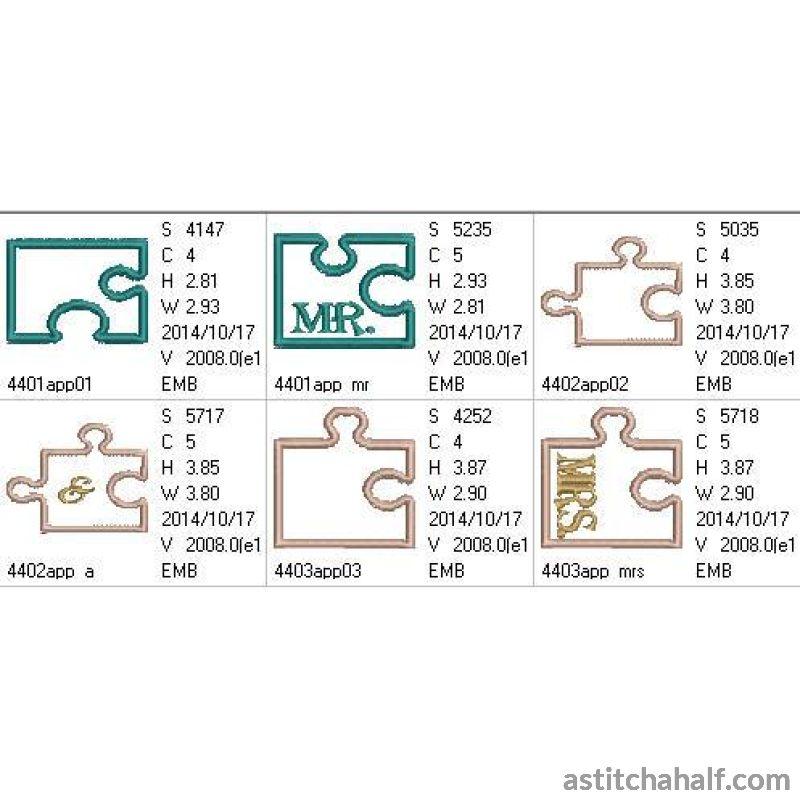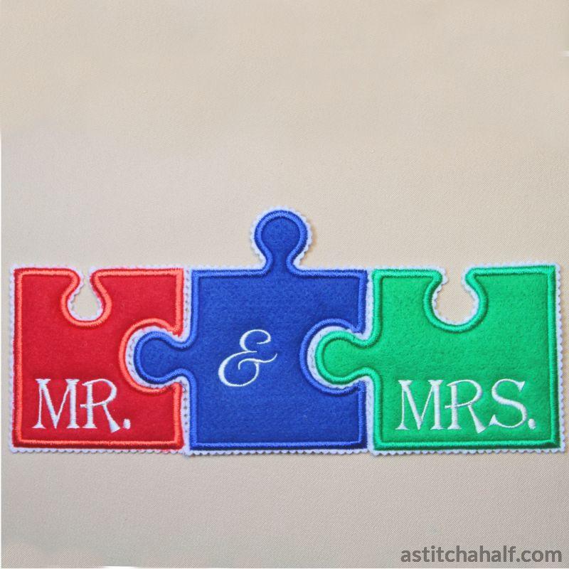 Your puzzle pieces will spell Mr & Mrs. You also get 3 blank pieces to customize. These designs can be stitched on fabric or completed as applique Stand Alone Pieces.
