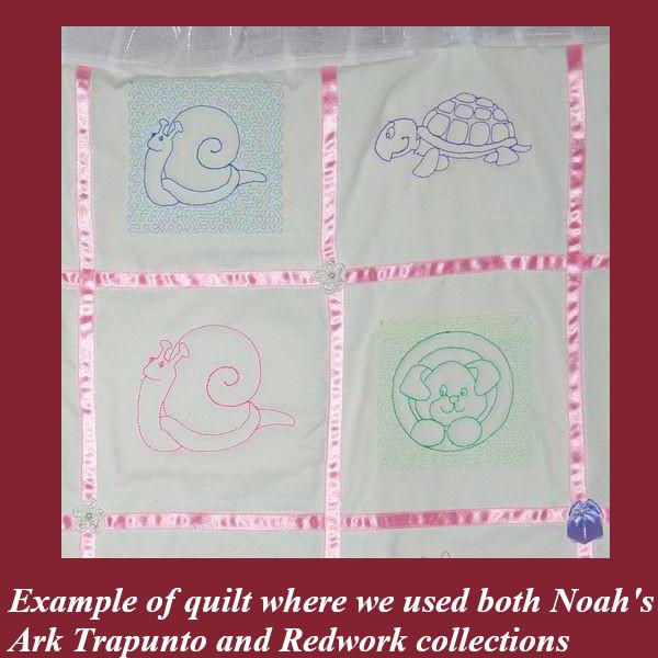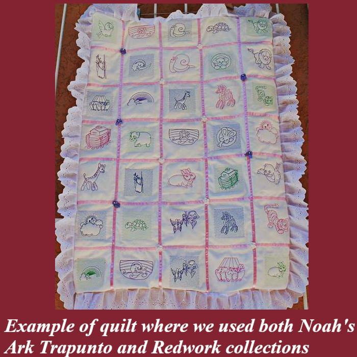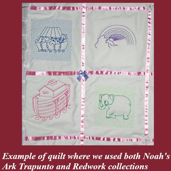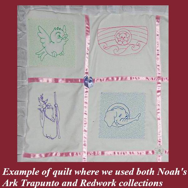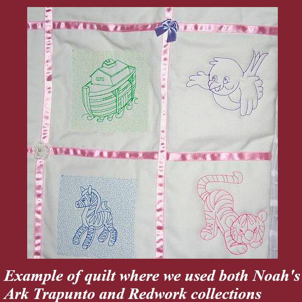Noah's Ark Trapunto will decorate a quilt and bring joy to your children. Trapunto designs, also called raised embroidery. Create beautiful projects with these designs. We made tea tray cloths, pot holders, book covers, coasters, place mats and off course, this lovely Baby Quilt.