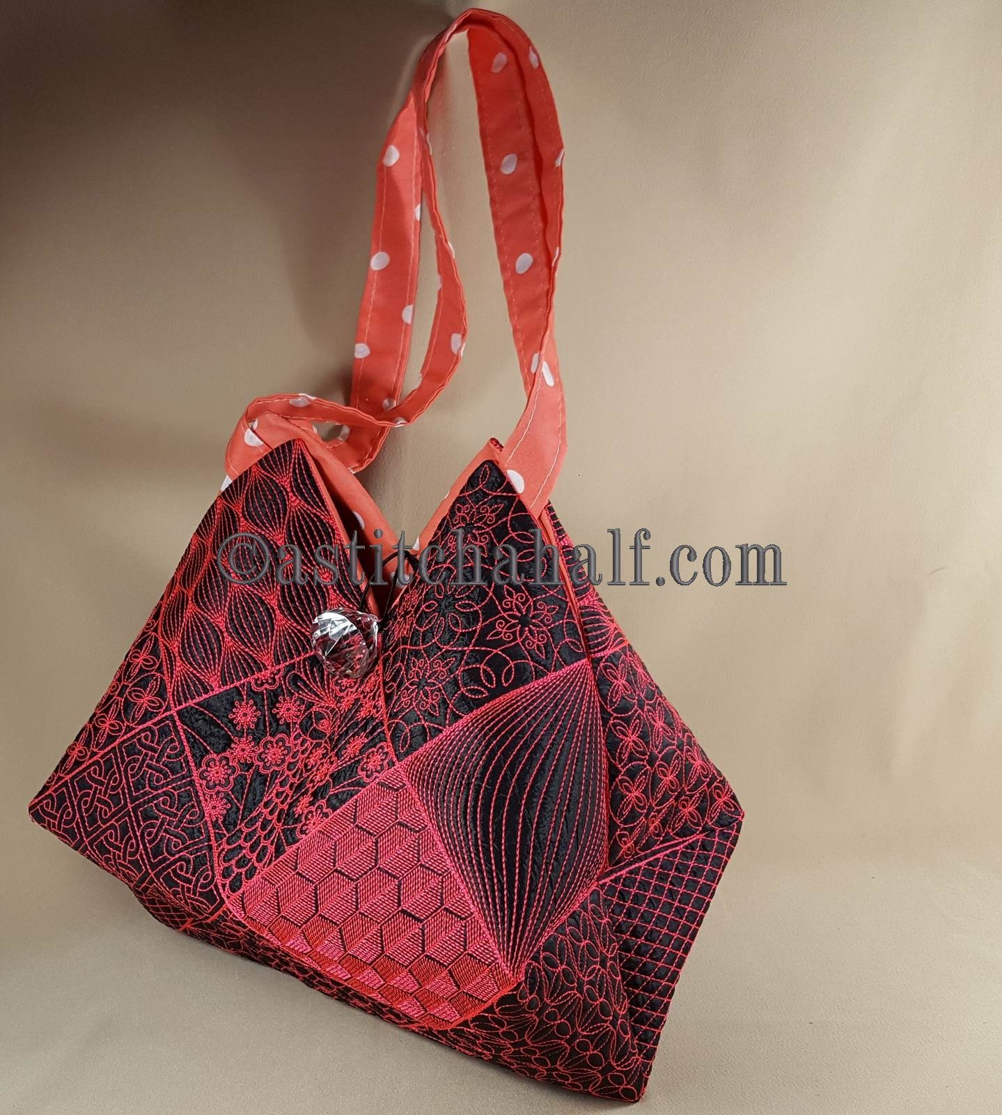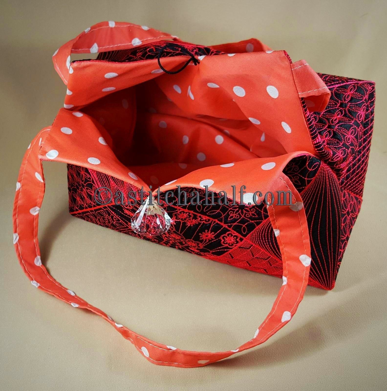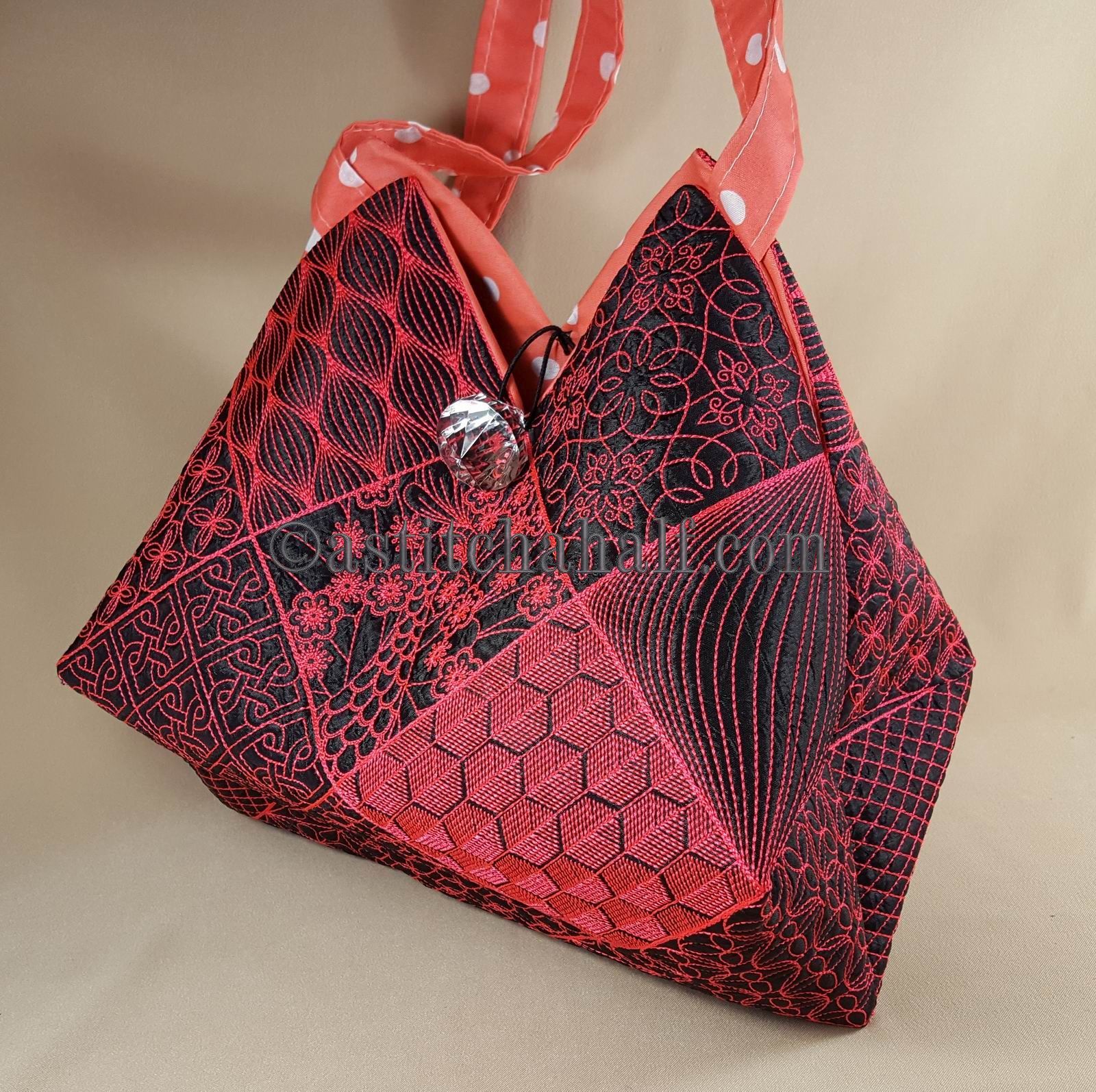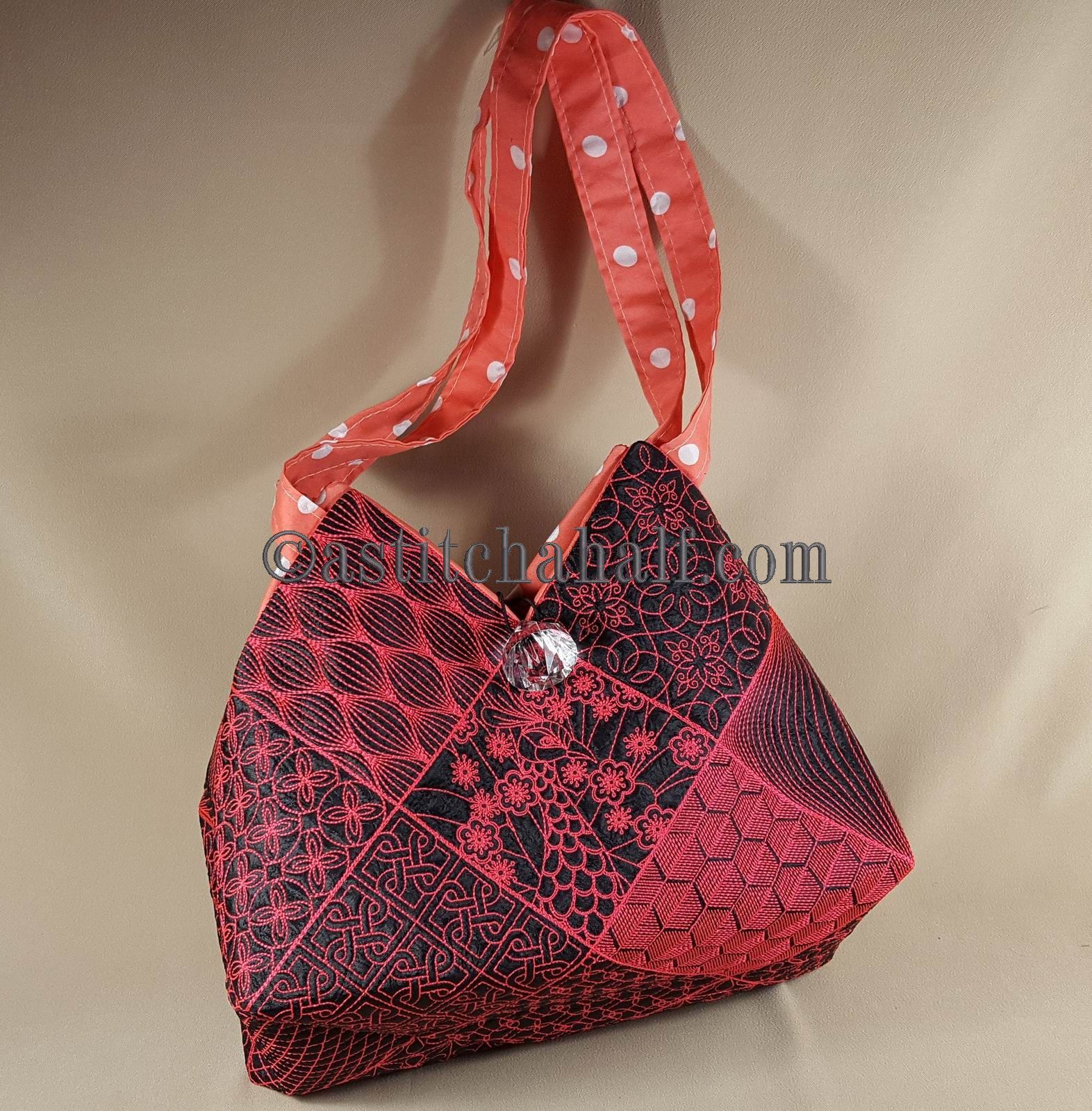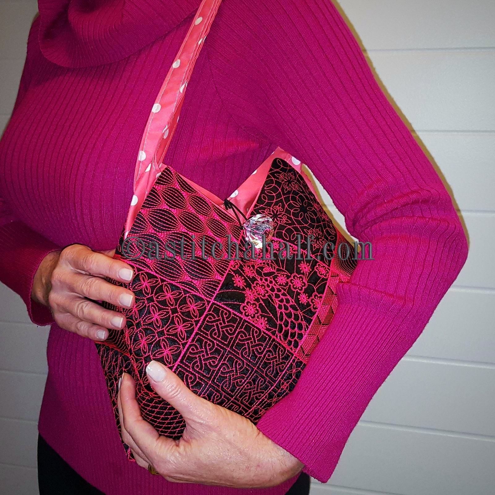 The Tote Bag using 4*4 Hoop designs will measure approx 12" high x 13" wide (a spacious yet elegant size bag)