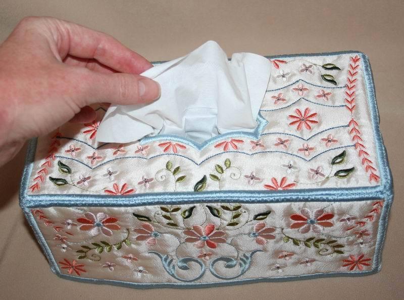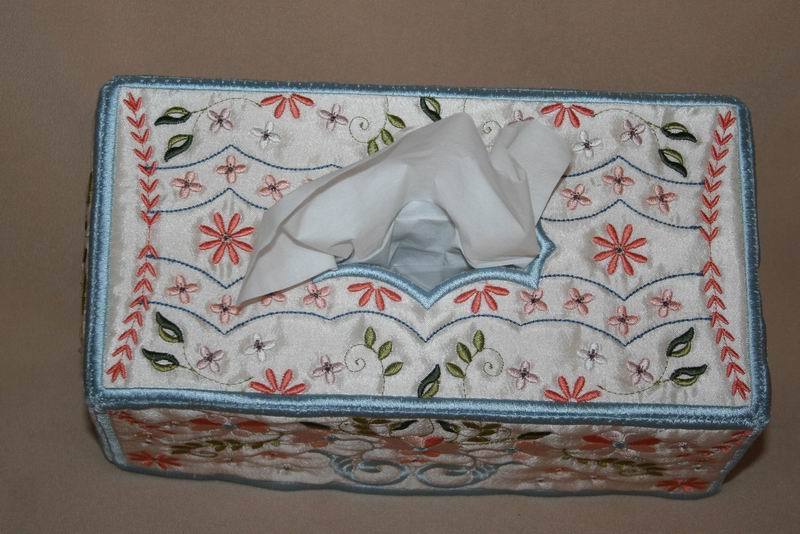 - Tissue Box Size when complete: height = 3.83" x width = 4.89" x length = 9.23" (fits the Kleenex tissue box for the 6x10 hoop)